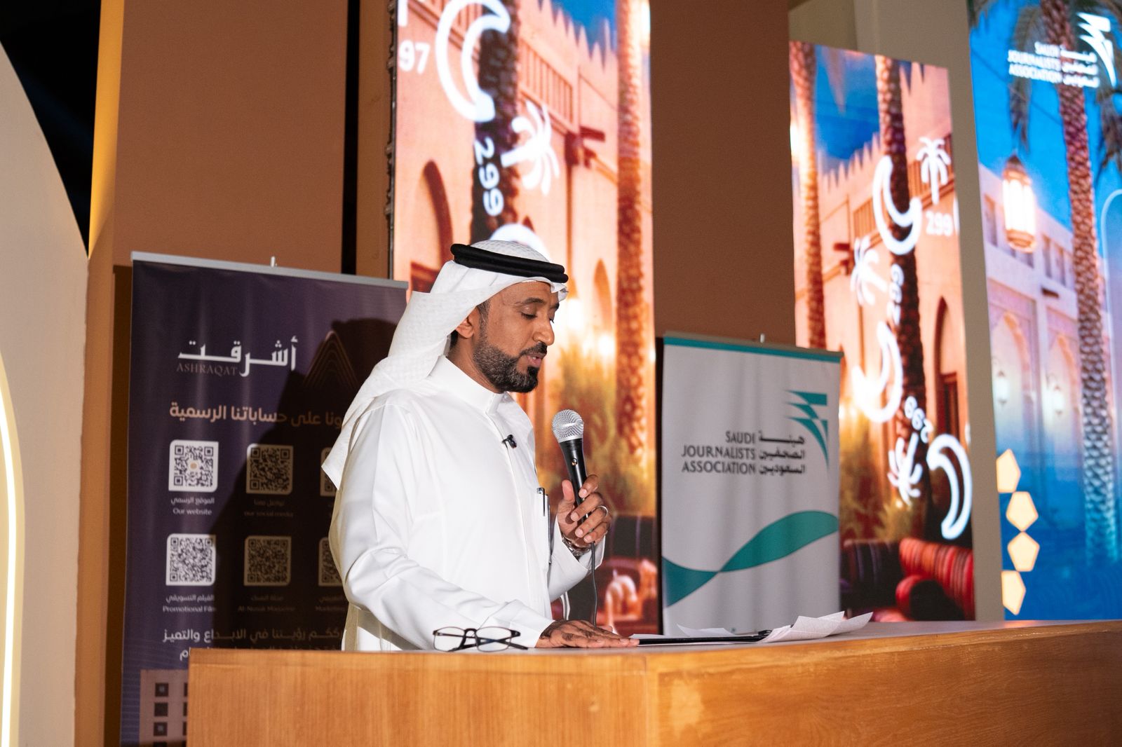 ورحب مدير فرع الهيئة بمنطقة مكة المكرمة الأستاذ فهد الإحيوي بالحضور كافة معرباً عن اعتزازه بهذا اللقاء الذي يجمع زملاء الحرف في ليلة رمضانية يفوح منها عبق التاريخ وفي مَعلم جليل يمتد أثره لأكثر من 1200 عام.