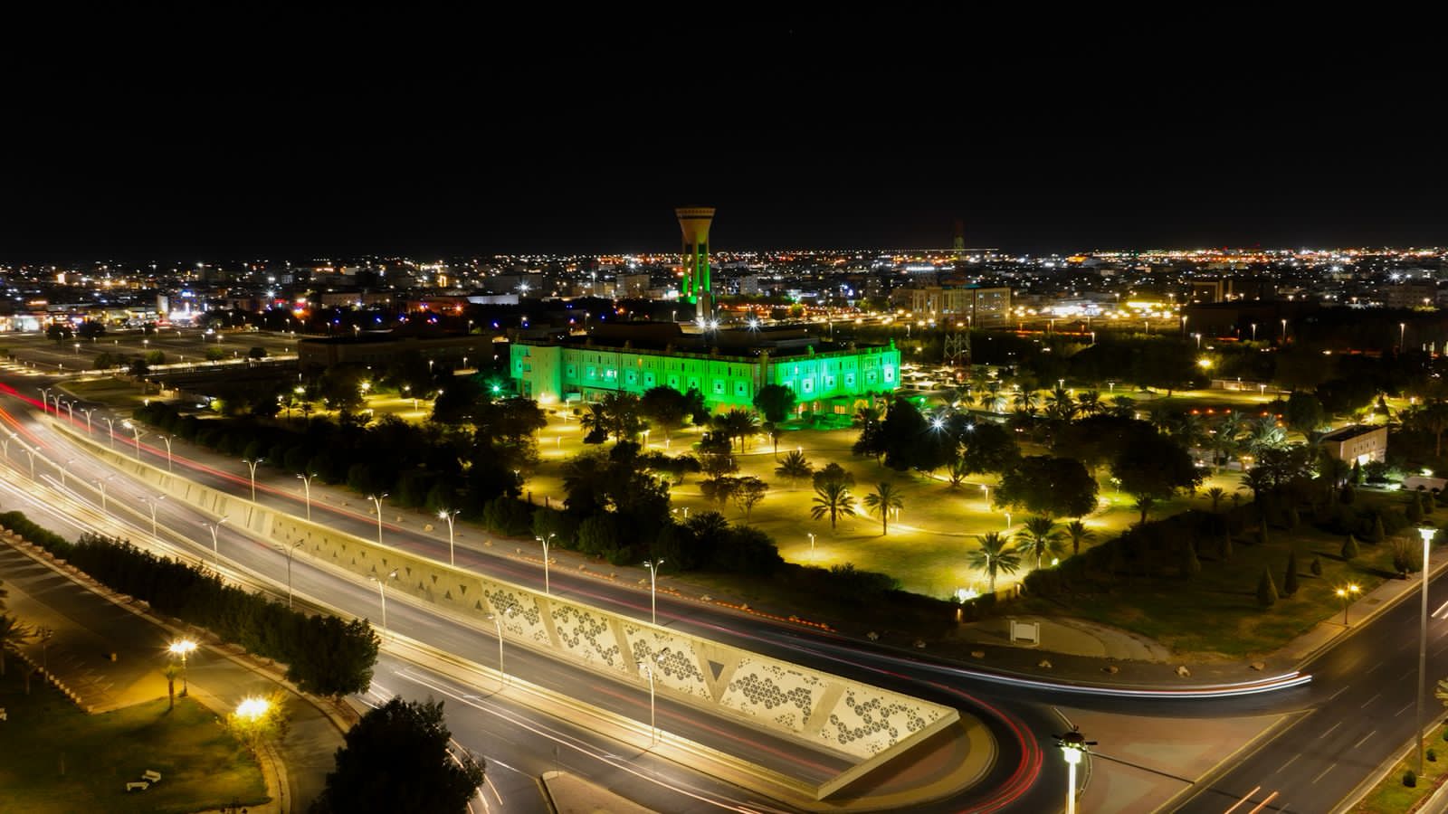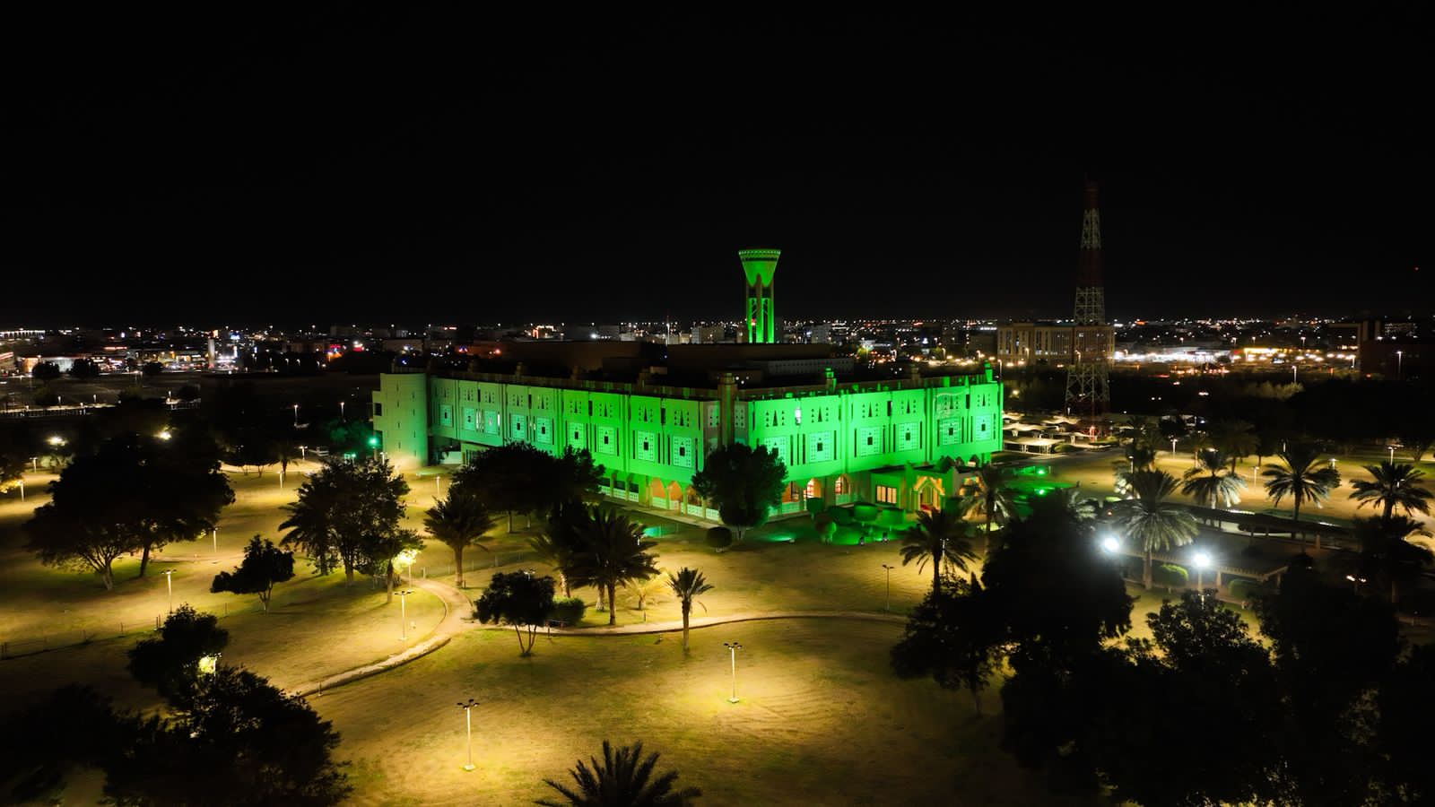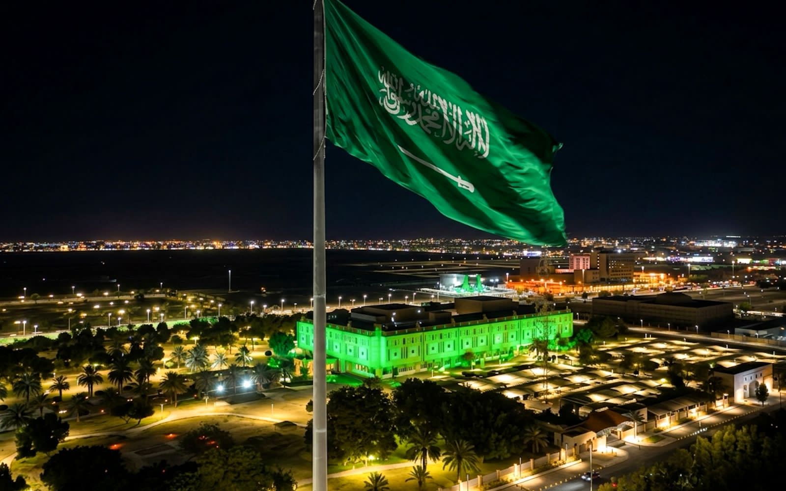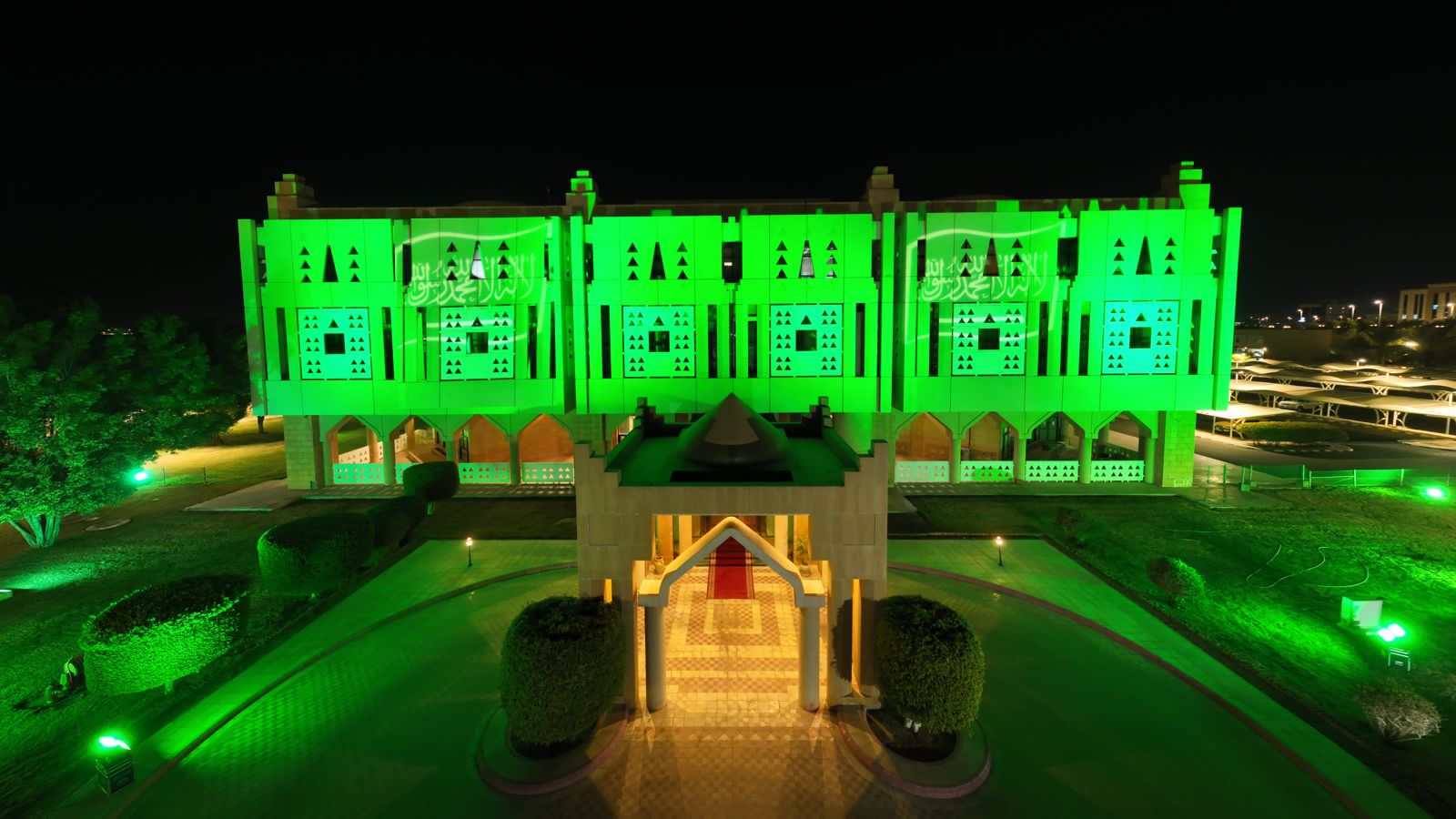 اكتسى مبنى إمارة منطقة تبوك ومباني المحافظات بالمنطقة باللون الأخضر وراية التوحيد احتفاءً بيوم العلم .