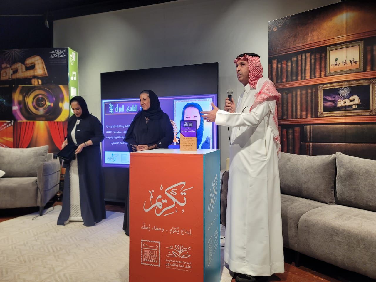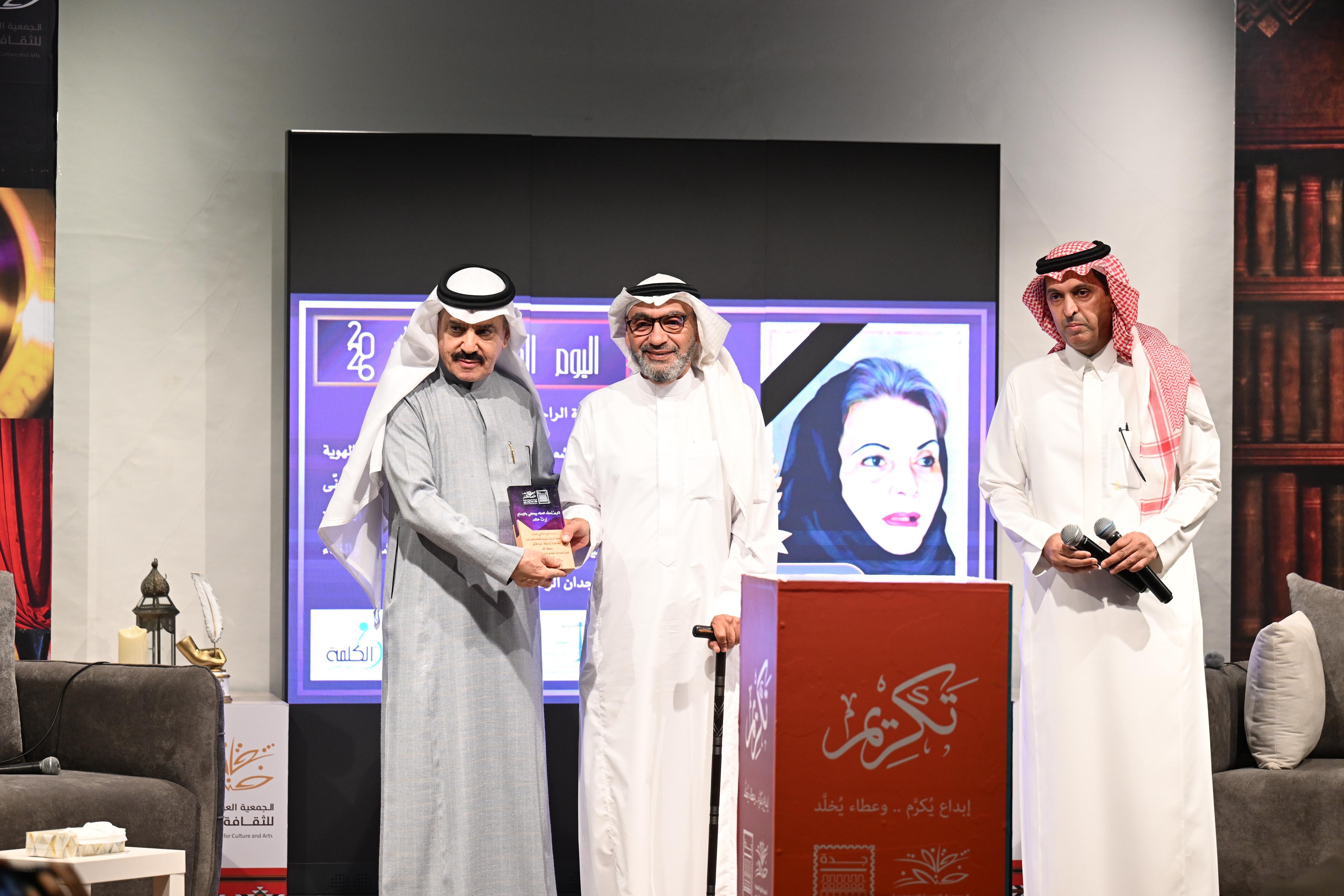 وفيما يخص تكريم الراحلتين، استلم ابن الشاعرة ثريا قابل درع التكريم معبرًا عن اعتزازه بوالدته ورسالتها الأدبية، فيما تسلمت الأستاذة كوثر الفرحان مديرة دار صفية بن زقر درع تكريم الفنانة الراحلة، معربة عن شكرها للجمعية على هذه المبادرة الوفية.
