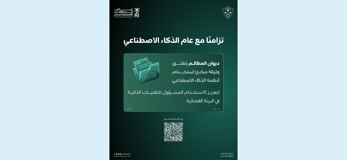وجَّه معالي رئيس ديوان المظالم رئيس مجلس القضاء الإداري د. علي بن أحمد الأحيدب بإطلاق وثيقة مبادئ استخدام أنظمة الذكاء الاصطناعي بديوان المظالم، تزامنًا مع موافقة مجلس الوزراء على تسمية عام 2026م عامًا للذكاء الاصطناعي، وذلك في إطار توجه ديوان المظالم لتعزيز توظيف التقنيات الحديثة في دعم كفاءة أعمال القضاء الإداري وترسيخ مبادئ الاستخدام المسؤول للتقنيات الذكية.