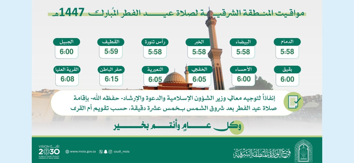 أكملت وزارة الشؤون الإسلامية والدعوة والإرشاد، ممثّلةً بفرعها في المنطقة الشرقية، جميع الاستعدادات لإقامة صلاة عيد الفطر المبارك لعام 1447هـ، حيث جرى تهيئة (1124) جامعاً ومسجداً ومصلى في مدن ومحافظات المنطقة، وذلك ضمن خطة الفرع لاستقبال المصلين في أجواء مهيأة. وشملت أعمال التهيئة تنفيذ برامج مكثفة في النظافة والصيانة والتشغيل، والعناية بالمصليات والجوامع وساحاتها، وتهيئة مرافقها وتجهيزها على الوجه المطلوب بما يضمن راحة المصلين.