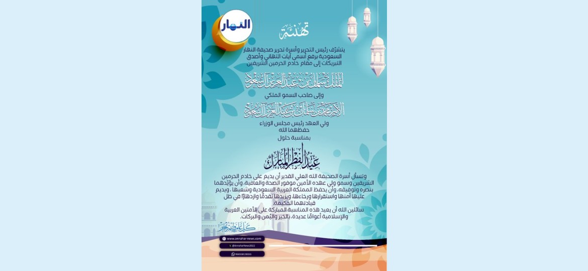 يتشرّف رئيس التحرير وأسرة تحرير صحيفة النهار السعودية برفع أسمى آيات التهاني وأصدق التبريكات إلى مقام خادم الحرمين الشريفين الملك سلمان بن عبدالعزيز آل سعود،وإلى صاحب السمو الملكي الأمير محمد بن سلمان بن عبدالعزيز آل سعود، ولي العهد رئيس مجلس الوزراء – حفظهما الله –