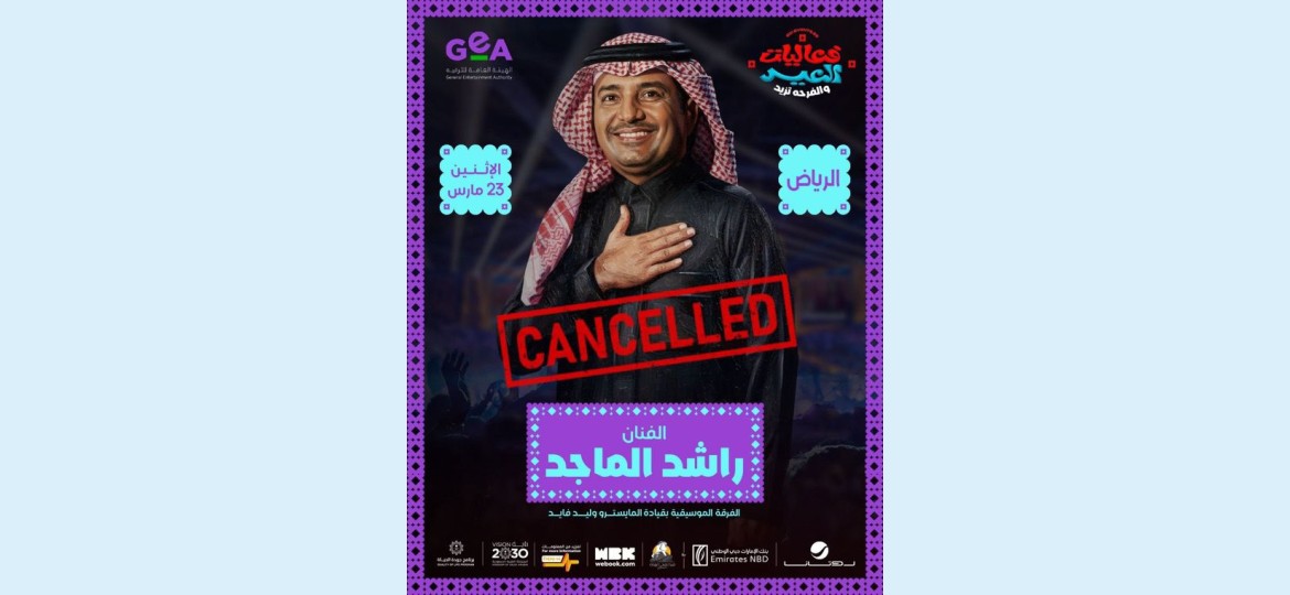 في خطوة تعكس أولوية الإنسان قبل الحدث، أعلنت Rotana Live إلغاء حفل الفنان راشد الماجد، الذي كان من المقرر إقامته ضمن فعاليات عيد الفطر، وذلك بعد تعرضه لعارض صحي طارئ استدعى اتخاذ هذا القرار المفاجئ.