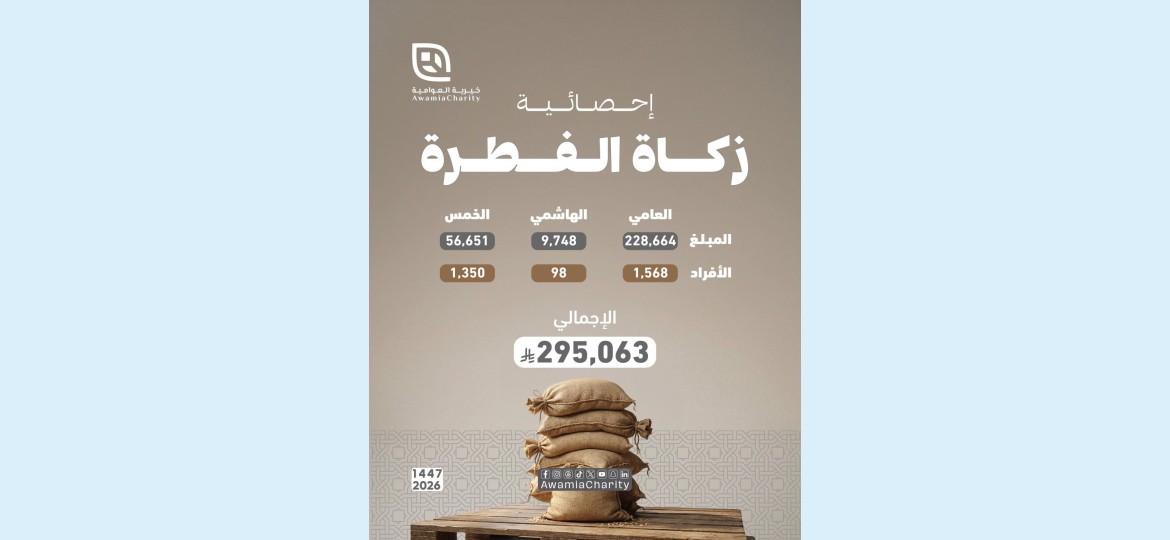 سجّلت خيرية العوامية ارتفاعًا ملحوظًا في إجمالي مبالغ زكاة الفطرة لعام 1447هـ (2026م)، حيث بلغت 295,063 ريالًا، مقارنة بـ253,267 ريالًا في العام الماضي 1446هـ، بزيادة قدرها 41,796 ريالًا، تمثل نموًا بنسبة 16.5% على أساس سنوي، مدفوعا بتسهيل الجمعية لوسائل الدفع بطرق متنوعة تسهل على جميع المكلفين دفع زكاتهم بالطريقة الأيسر والأسهل لهم.