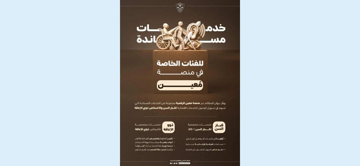أعلن  ديوان المظالم  -ممثلًا في مركز إدارة العمليات القضائية- عن إضافة عددٍ من الامتيازات لصالح مستفيدي منصة مُعين الرقمية والبوابة الرقمية وخدمات التواصل من كبار السن والأشخاص ذوي الإعاقة، حيث منحت الامتيازات الحديثة الأولوية لكبار السن في خدمات المستفيدين والمساعدات التعريفية والذكية لمن تجاوزت أعمارهم خمسةً وستين عامًا، شريطة الإفصاح عن ذلك وإثباته.