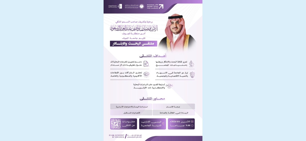 تنظم جامعة الجوف الاثنين المقبل "ملتقى البحث والابتكار"، وذلك في المبنى الإداري بالمدينة الجامعية بمدينة سكاكا.