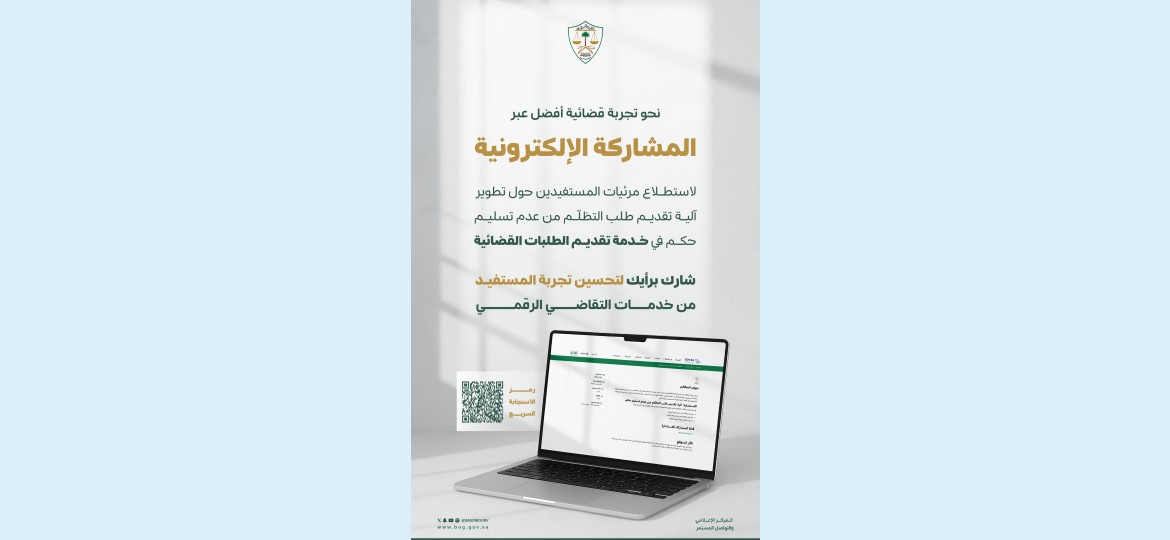 ويؤكد ديوان المظالم، بمتابعة معالي رئيس ديوان المظالم رئيس مجلس القضاء الإداري د. علي بن أحمد الأحيدب وبناءً على توجيهه، أن تضمين مرئيات المستفيدين في تطوير الخدمات يُعد أحد الممكنات الرئيسة لتحسين تجربة التقاضي الرقمي وتعزيز كفاءة المنصات القضائية، بما يحقق الأهداف التطويرية المنشودة ويرتقي بجودة الأداء، داعيًا المستفيدين إلى المشاركة بآرائهم عبر الاستطلاع؛ للإسهام في تطوير منظومة الخدمات القضائية الرقمية.