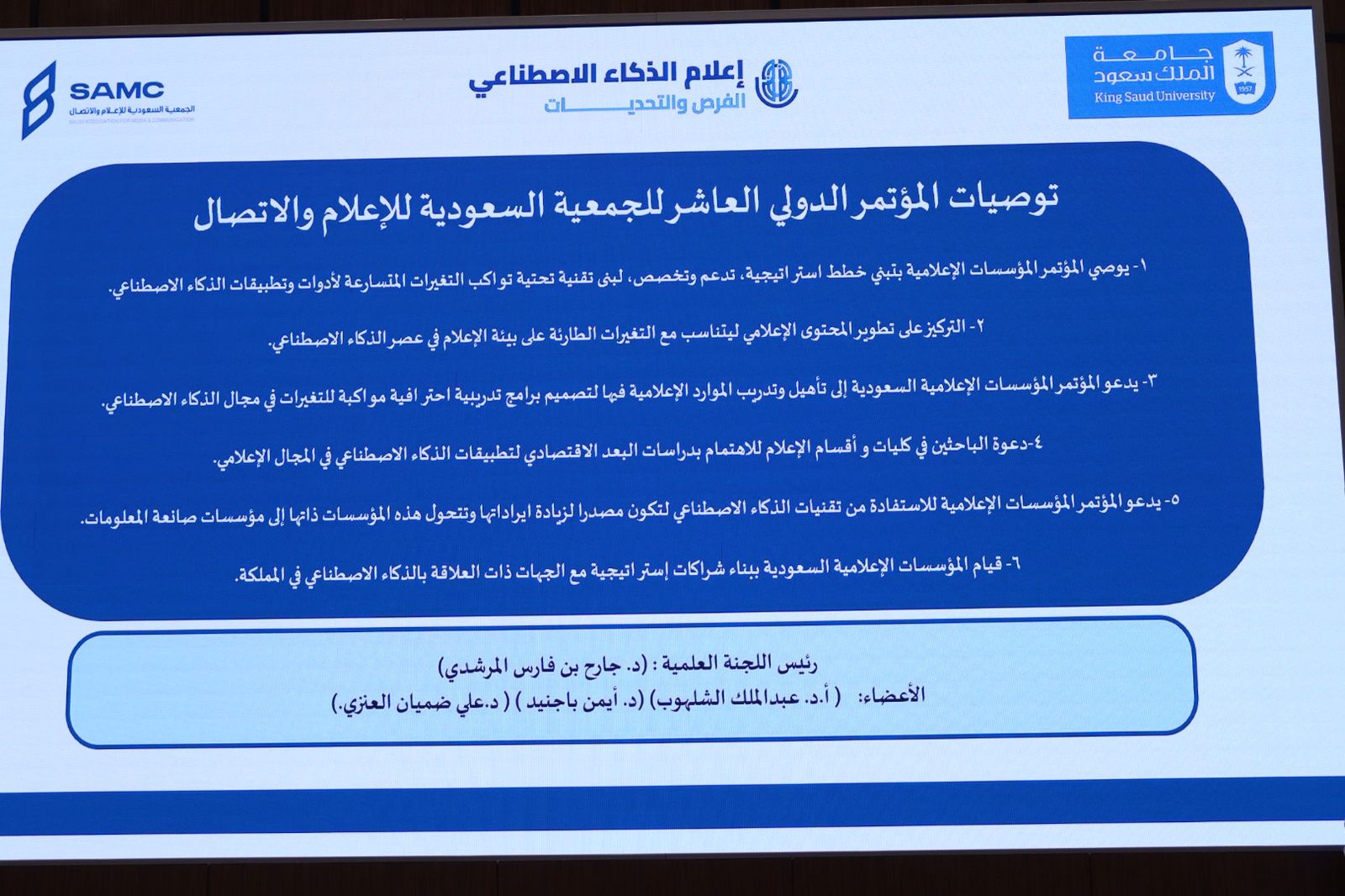 اختتمت اليوم الأربعاء أعمال المؤتمر الدولي العاشر "إعلام الذكاء الاصطناعي.. الفرص والتحديات" الذي نظمته الجمعية السعودية للإعلام والاتصال على مدى يومي الثلاثاء والأربعاء 7 – 8 أبريل 2026م بفندق مداريم كراون الرياض تزامنا مع اختيار 2026 عام الذكاء الاصطناعي، وشمل المؤتمر 9 جلسات بجانب الجلسة الأخيرة للتوصيات ، واستضاف 40 متحدثاً ومتحدثة من داخل المملكة وخارجها.