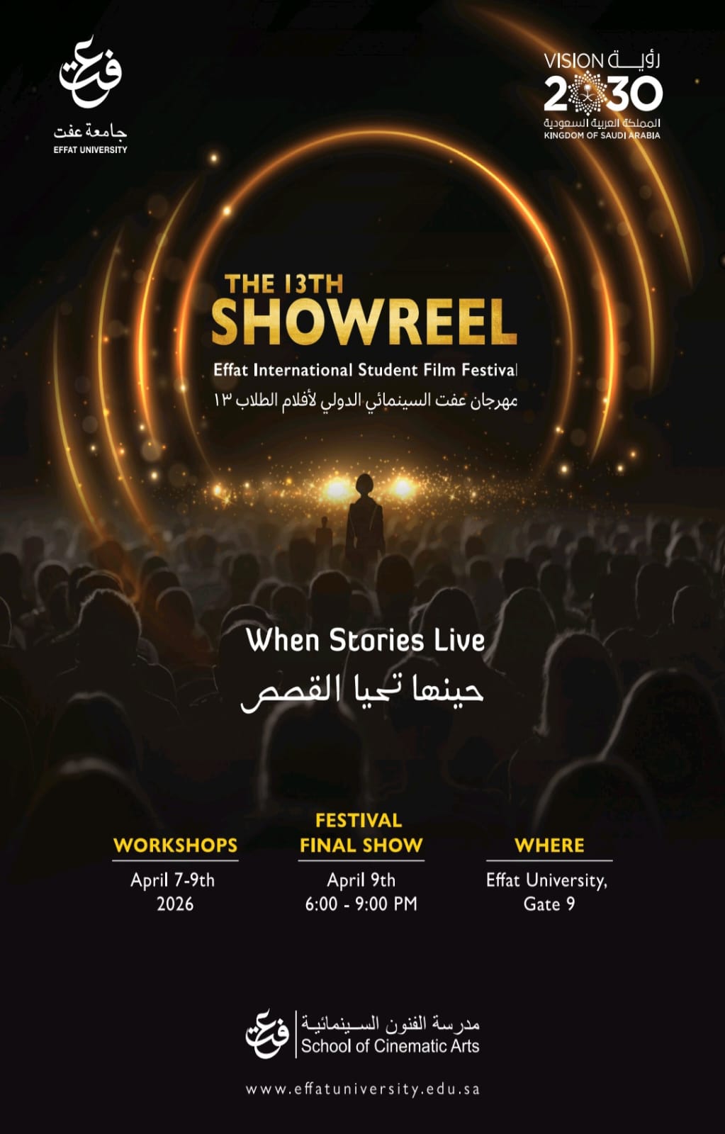 واستضافت جامعة عفت في جدة النسخة الـ13 من مهرجان شوريل الدولي لأفلام الطلاب (Showreel) خلال الفترة من 7 إلى 9 أبريل 2026، تحت شعار "حينما تحيا القصص".