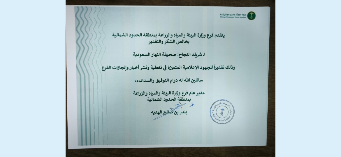 قدّم فرع وزارة البيئة والمياه والزراعة بمنطقة الحدود الشمالية شهادة شكر وتقدير لصحيفة "النهار السعودية"، تقديراً لجهودها الإعلامية المتميزة في تغطية ونشر أخبار وإنجازات الفرع.