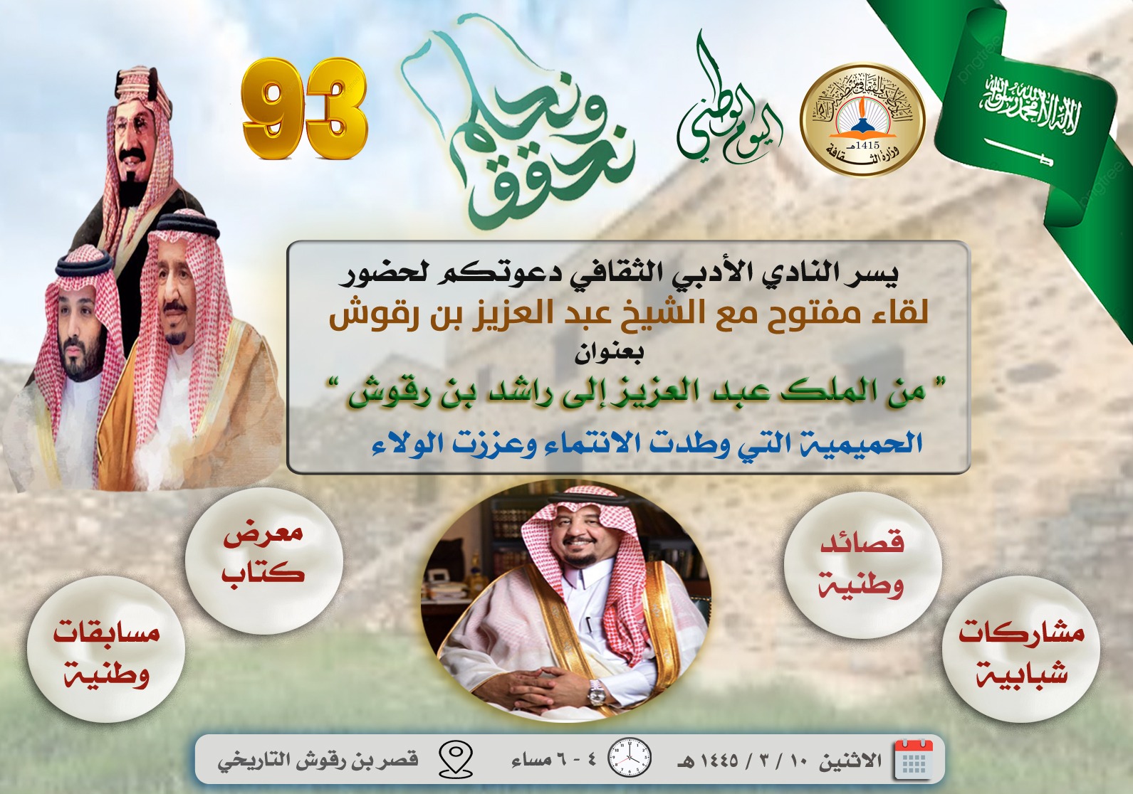 يحتفل  نادي الباحة الأدبي الثقافي  باليوم الوطني٩٣ بحزمة من الفعاليات الوطنية التي تعبّر عن ابتهاج ابناء هذا الوطن بهذه المناسبة العزيزة على قلوبنا جميعًا ،