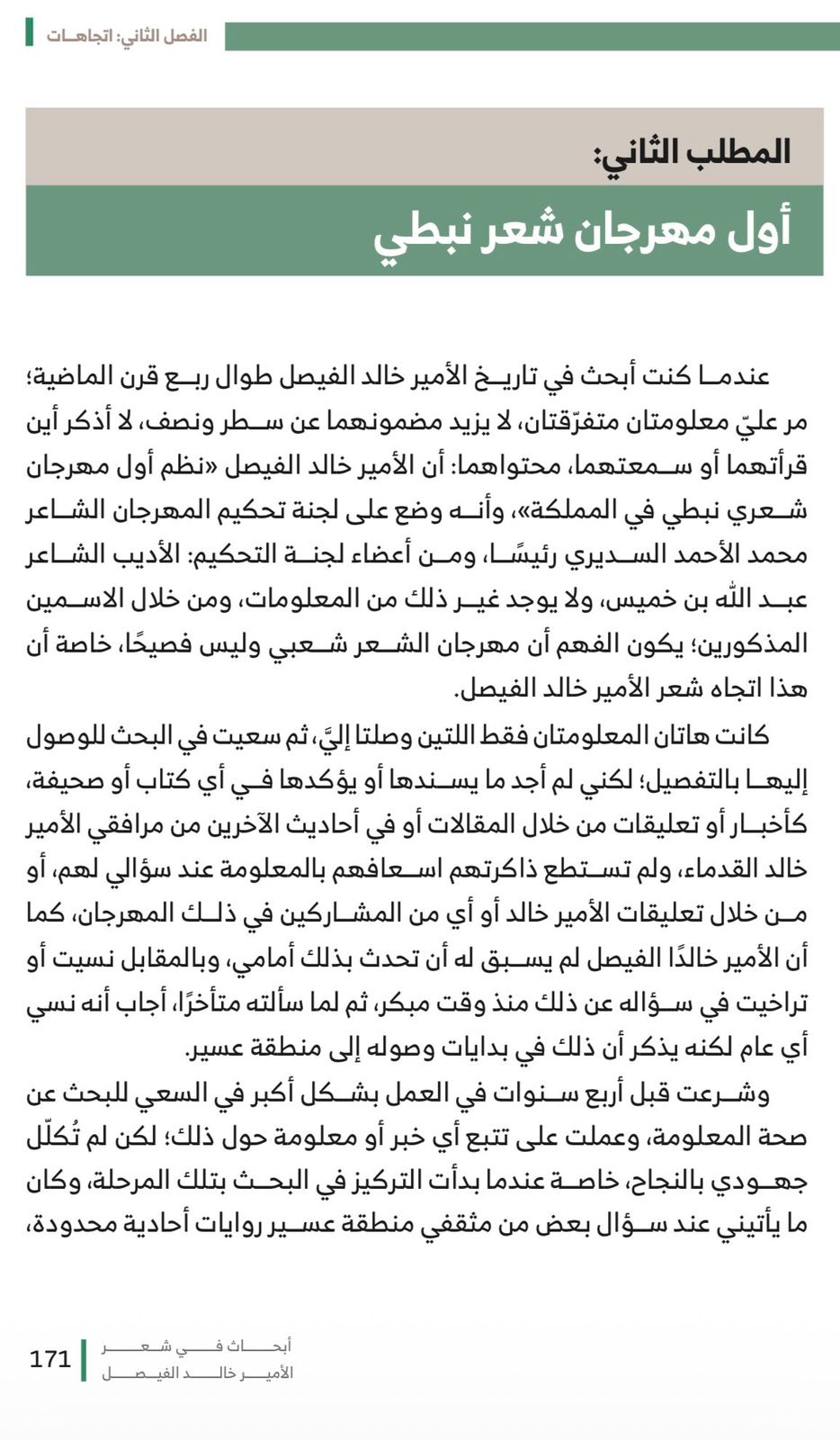 كما استعرض الكتاب مبادرات الأمير الثقافية، ومن أبرزها إحياء سوق عكاظ عام 1385هـ، وتنظيم أول مهرجان للشعر الشعبي في منطقة عسير عام 1393هـ، بمشاركة نخبة من الأدباء والشعراء، من بينهم عبدالله بن خميس.