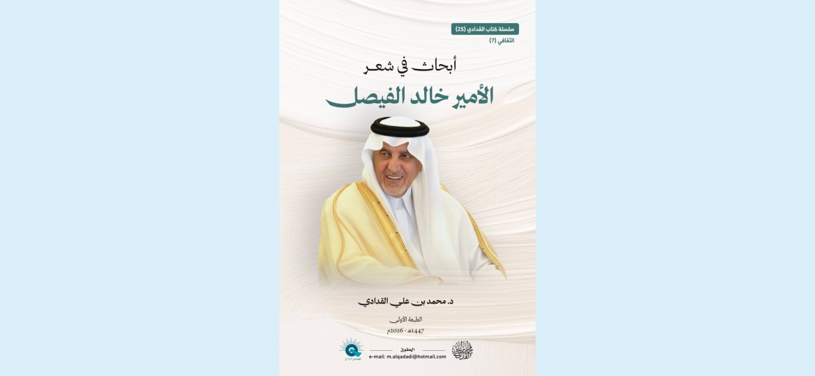 صدر حديثًا للدكتور محمد علي القدادي كتابه الجديد بعنوان «أبحاث في شعر الأمير خالد الفيصل»، في إصدارٍ يضاف إلى منجزه الثقافي، ويُعد العمل الخامس والعشرين ضمن سلسلة «كتاب القدادي»، والسابع في إطار إصداراته الثقافية المتخصصة.