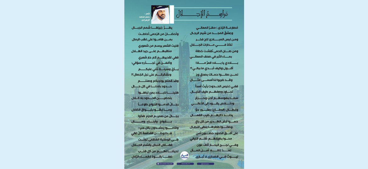 تنبثق من بين هذه الملاحم قصيدة "مراسم الإجلال" للأديب الشاعر: حسن محمد الزهراني، لتكون صوتًا شعريًا نابضًا بالاعتزاز، يُجسّد مكانة أبطال الوطن من حرس الحدود إلى رجال الدفاع، الذين يسطرون مواقف البطولة ويرتقون بمعاني التضحية إلى ذرى المجد.
