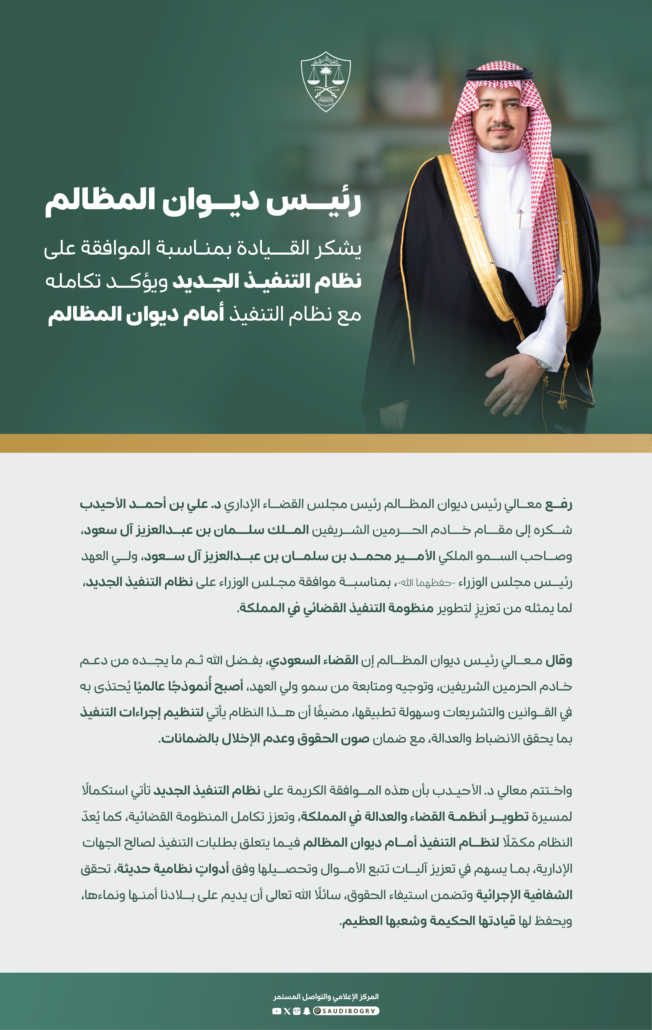 واختتم معالي د. الأحيدب بأن هذه الموافقة الكريمة على نظام التنفيذ الجديد تأتي استكمالًا لمسيرة تطوير أنظمة القضاء والعدالة في المملكة، وتعزز تكامل المنظومة القضائية، كما يُعدّ النظام مكمّلًا لنظام التنفيذ أمام ديوان المظالم فيما يتعلق بطلبات التنفيذ لصالح الجهات الإدارية، بما يسهم في تعزيز آليات تتبع الأموال وتحصيلها وفق أدواتٍ نظامية حديثة، تحقق الشفافية الإجرائية وتضمن استيفاء الحقوق، سائلًا الله تعالى أن يديم على بلادنا أمنها ونماءها، ويحفظ لها قيادتها الحكيمة وشعبها العظيم.