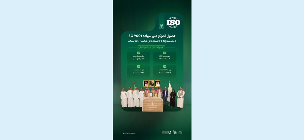 حصل المركز الوطني لتنمية  الغطاء النباتي  ومكافحة التصحر على شهادة ISO 9001 في تطبيق معايير الجودة العالمية في أعماله ومشاريعه بمجال إدارة الغابات؛ بما يُسهم في تطوير منظومة العمل المؤسسي من خلال توحيد الإجراءات، ورفع كفاءة العمليات التشغيلية، كما يضمن تعزيز الإدارة المستدامة للغابات، ويسهم في تحسين جودة الخدمات البيئية.