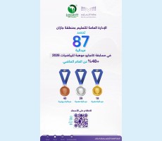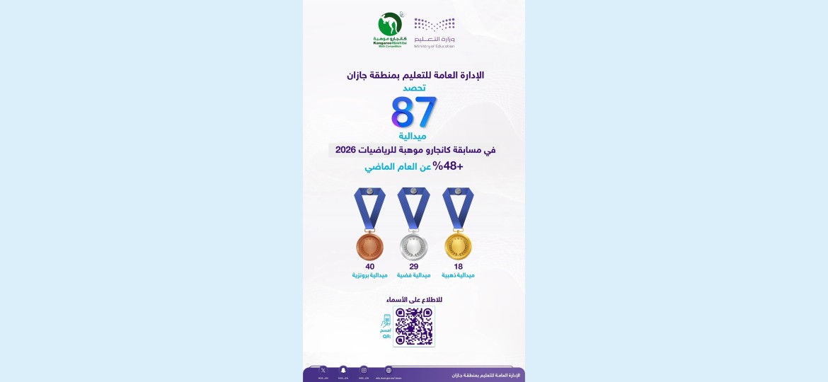 حصدت الإدارة العامة للتعليم بمنطقة جازان (87) ميدالية في مسابقة "كانجارو موهبة" للرياضيات 2026، التي تنظمها مؤسسة الملك عبدالعزيز ورجاله للموهبة والإبداع "موهبة" بالتعاون مع وزارة التعليم، محققةً نموًا بنسبة (48%) مقارنة بالعام الماضي، بعد أن نال طلاب وطالبات المنطقة (18) ميدالية ذهبية، و(29) فضية، و(40) برونزية.