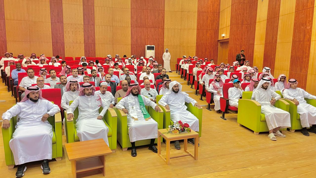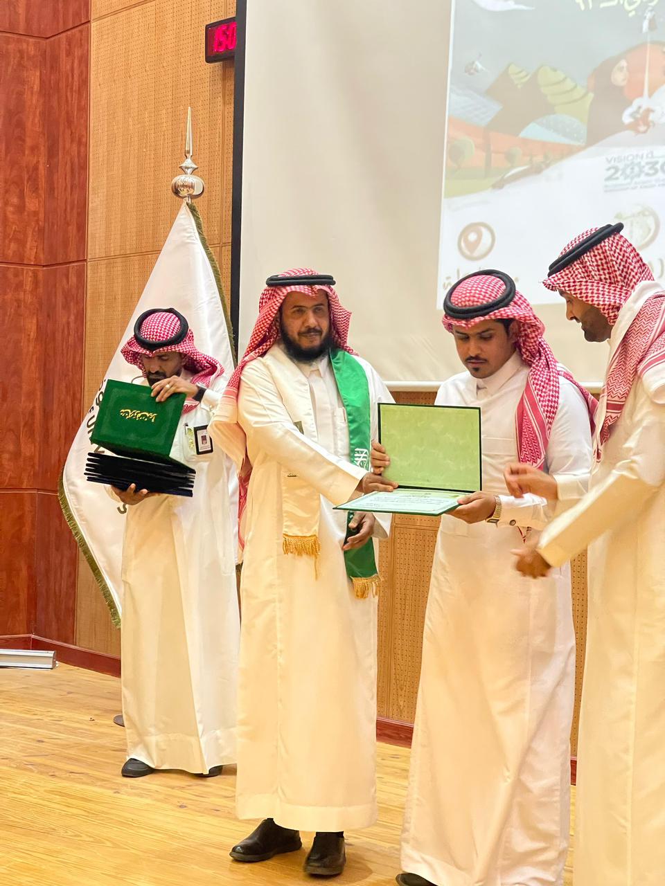 وفي الختام قام سعادة العميد ووكيل الكلية بتكريم الطلاب المتفوقين، كما قدم سعادة العميد عميق شكره وتقديره لأعضاء هيئة التدريس والموظفين على ما يقومون به من جهود في خدمة الدين والوطن.