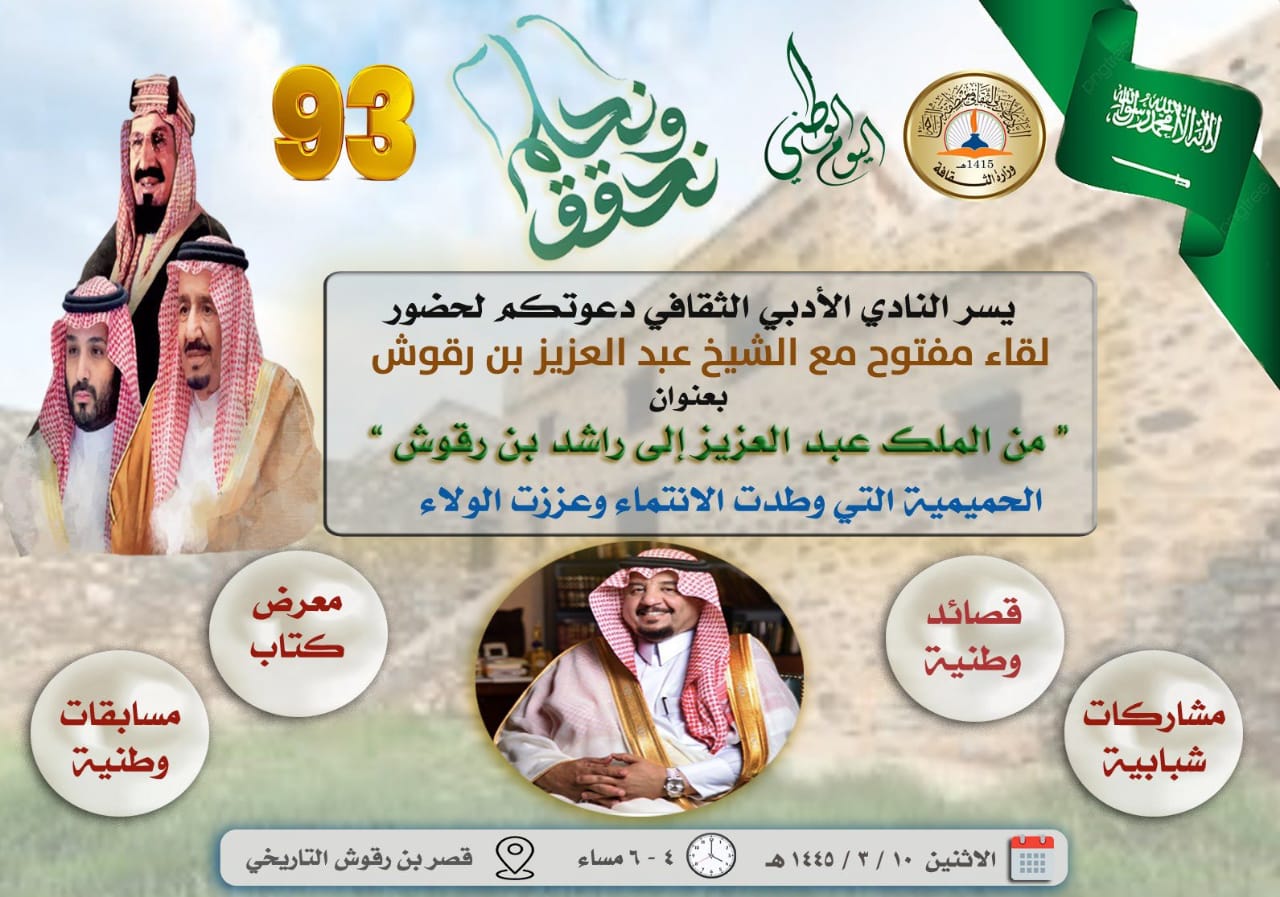 وفي السياق نفسه، أقيمت مساءً أمسية شعرية وطنية، بعد المغرب في منزل الشيخ عبدالعزيز بن رقوش، لعدد من الشعراء المبدعين، استمتع فيها الحضور بجميل القصيد، الذي تغنى بالوطن ورموزه ورجالاته، ومنجزاته الفاخرة. بعدها انتقل الجميع لتناول طعام العشاء.