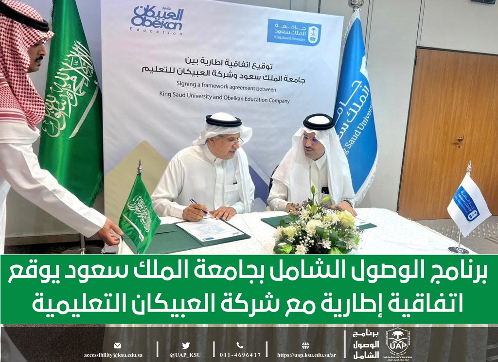نيابة عن نائب رئيس جامعةالملك سعود للشؤون التعليمية والأكاديمية وقع المشرف على برنامج الوصول الشامل د. ناصر العجمي، اتفاقية تعاون إطارية، مع مدير مكتبة العبيكان للنشر والترجمة، الأستاذ محمد الفريح،