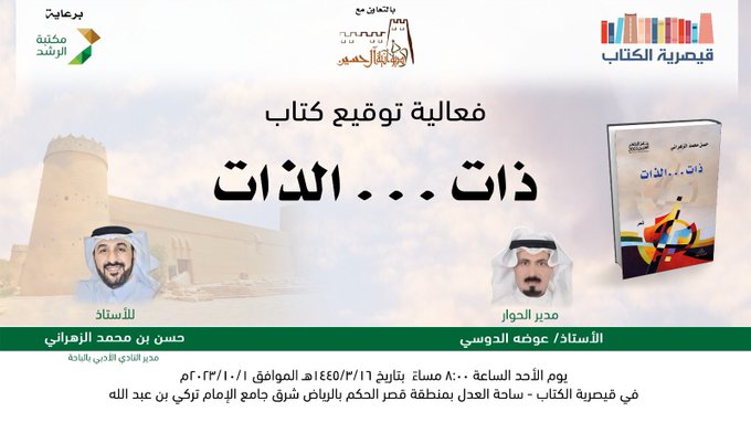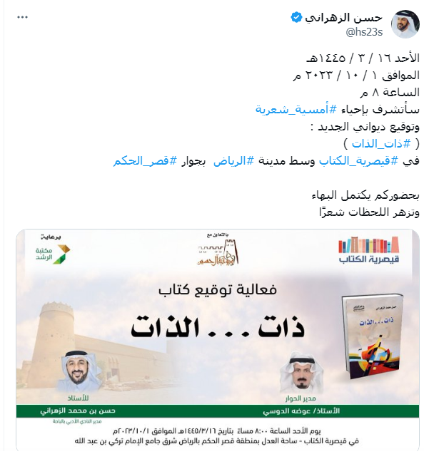 ومن جانبه دعا الشاعر حسن الزهراني عبر حسابه الرسمي على منصة التواصل الاجتماعي إكس،، المهتمين قائلاً :«الأحد ١٦ / ٣ / ١٤٤٥هـ..الموافق ١ / ١٠ / ٢٠٢٣ م..الساعة ٨ م..سأتشرف بإحياء أمسية شعرية..وتوقيع ديواني الجديد :(ذات الذات)..في قيصرية الكتاب وسط مدينة الرياض بحضوركم يكتمل البهاء..وتزهر اللحظات شعرًا».