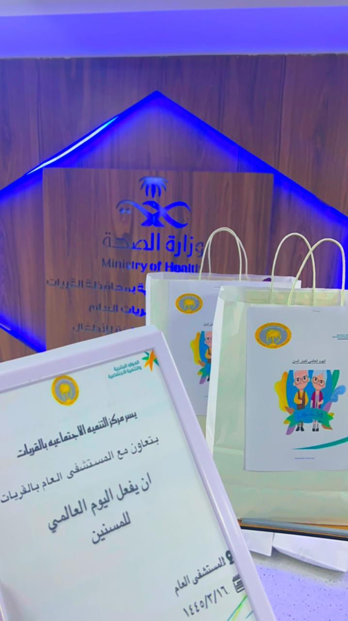 فعل مركز التنمية الاجتماعية بمحافظة القريات يوم الأحد الموافق ١٤٤٥/٣/١٦هـ اليوم العالمي للمسنين بالتعاون مع مستشفى القريات العام .
