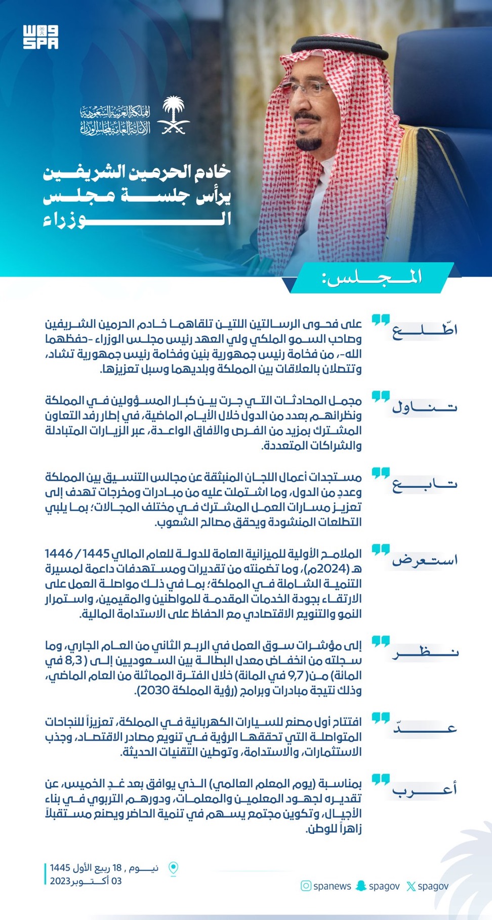 وفي بداية الجلسة، اطّلع مجلس الوزراء على فحوى الرسالتين اللتين تلقاهما خادم الحرمين الشريفين، وصاحب السمو الملكي ولي العهد رئيس مجلس الوزراء - حفظهما الله -، من فخامة رئيس جمهورية بنين، وفخامة رئيس جمهورية تشاد، وتتصلان بالعلاقات بين المملكة وبلديهما وسبل تعزيزها.
