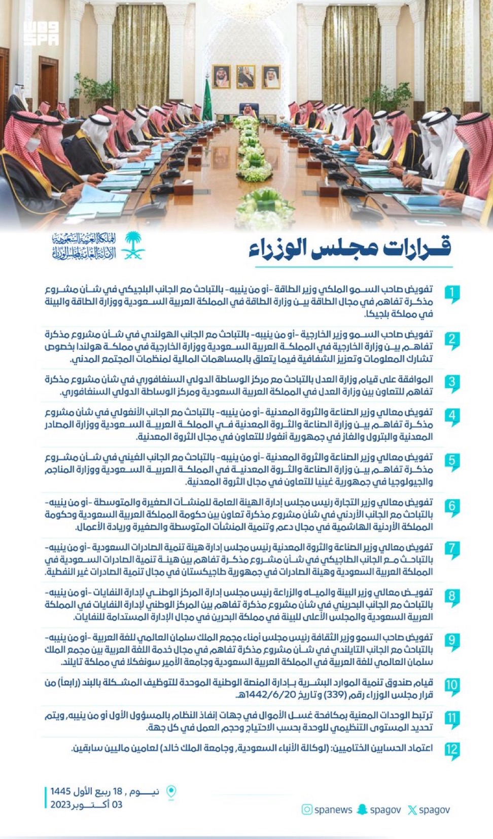 تفويض صاحب السمو الملكي وزير الطاقة - أو من ينيبه - بالتباحث مع الجانب البلجيكي في شأن مشروع مذكرة تفاهم في مجال الطاقة بين وزارة الطاقة في المملكة العربية السعودية ووزارة الطاقة والبيئة في مملكة بلجيكا.