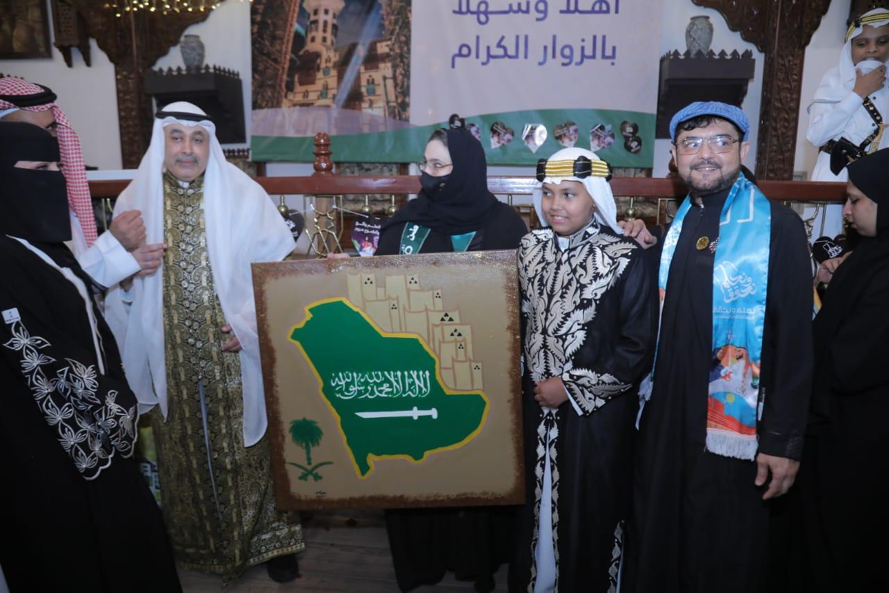 حملت 35 لوحة تشكيلية محلية وعالمية رسائل حب وامتنان للقيادة السعودية، خلال احتفالية  مدينة الطيبات العالمية للعلوم والمعرفة بجدة  المستمرة بيوم الوطن 93، ودشنت سمو الاميرة غادة بنت فهد بن محمد آل سعود، فعاليات البيت الحجازي والمعرض الفني المصاحب لاكثر من 100 لوحة فنية أمس، بالتزامن مع عروض فلكلورية ورقصات نجدية وحجازية وجنوبية وعروض أزياء تراثية تروي مسيرة الوطن، وتجسد معاني الوفاء.