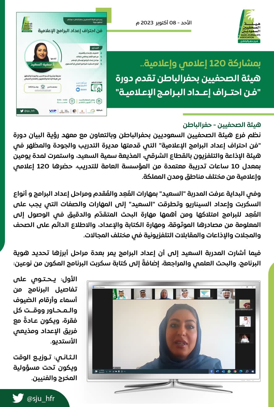 نظم فرع هيئة الصحفيين السعوديين بحفر الباطن وبالتعاون مع معهد رؤية البيان دورة "فن احتراف إعداد البرامج الإعلامية" التي قدمتها مديرة التدريب والجودة والمظهر في هيئة الإذاعة والتلفزيون بالقطاع الشرقي، المذيعة سمية السعيد، استمرت لمدة يومين بمعدل 10 ساعات تدريبة معتمدة من المؤسسة العامة للتدريب، حضرها 120 إعلامي وإعلامية من مختلف مناطق ومدن المملكة.