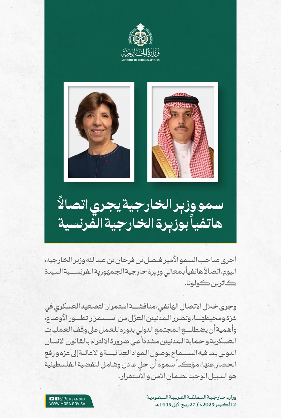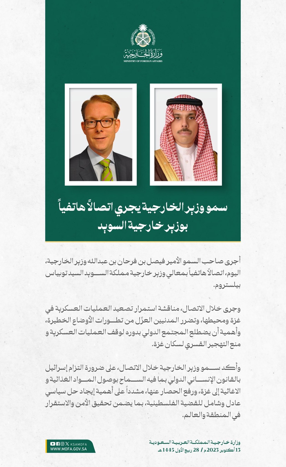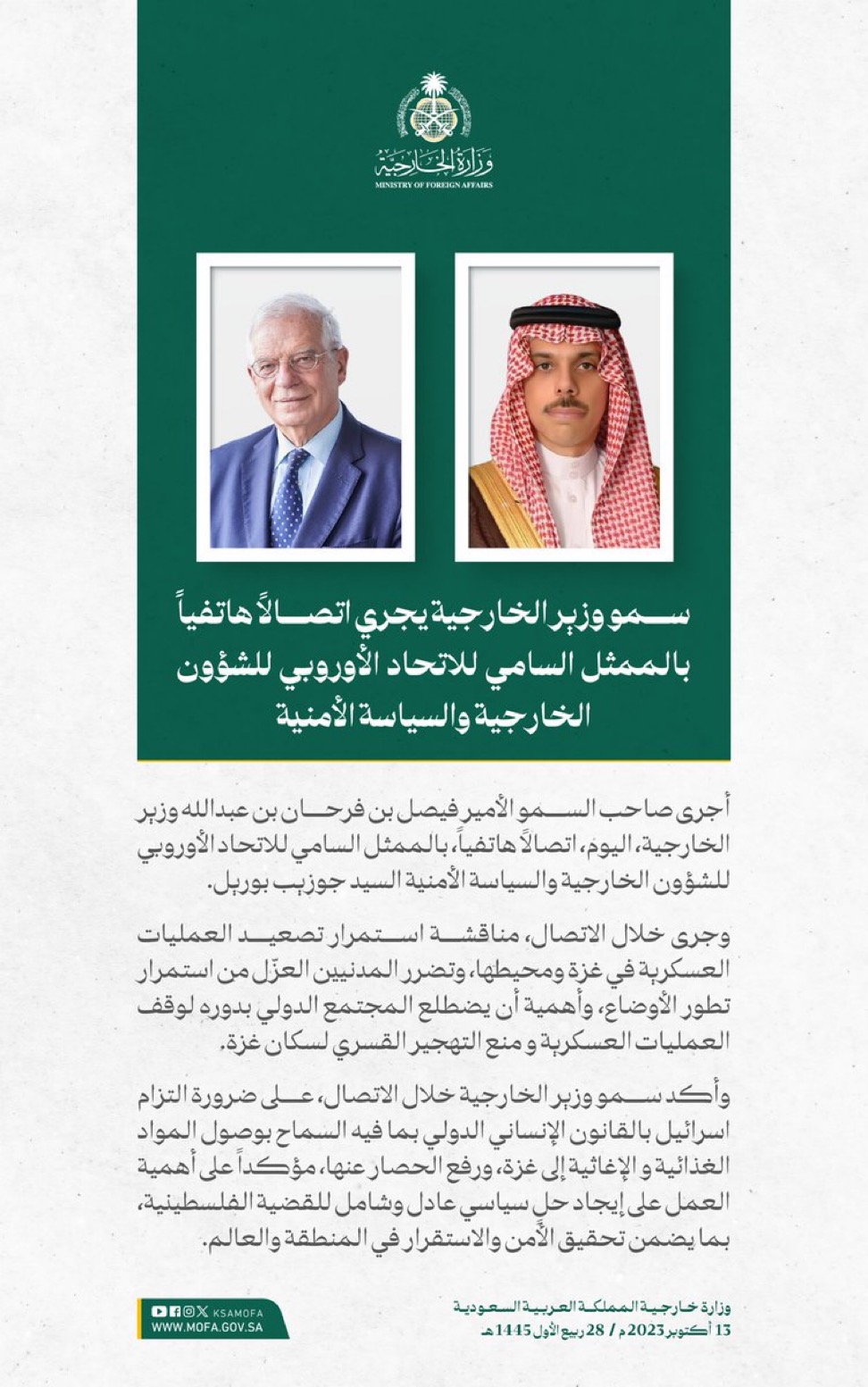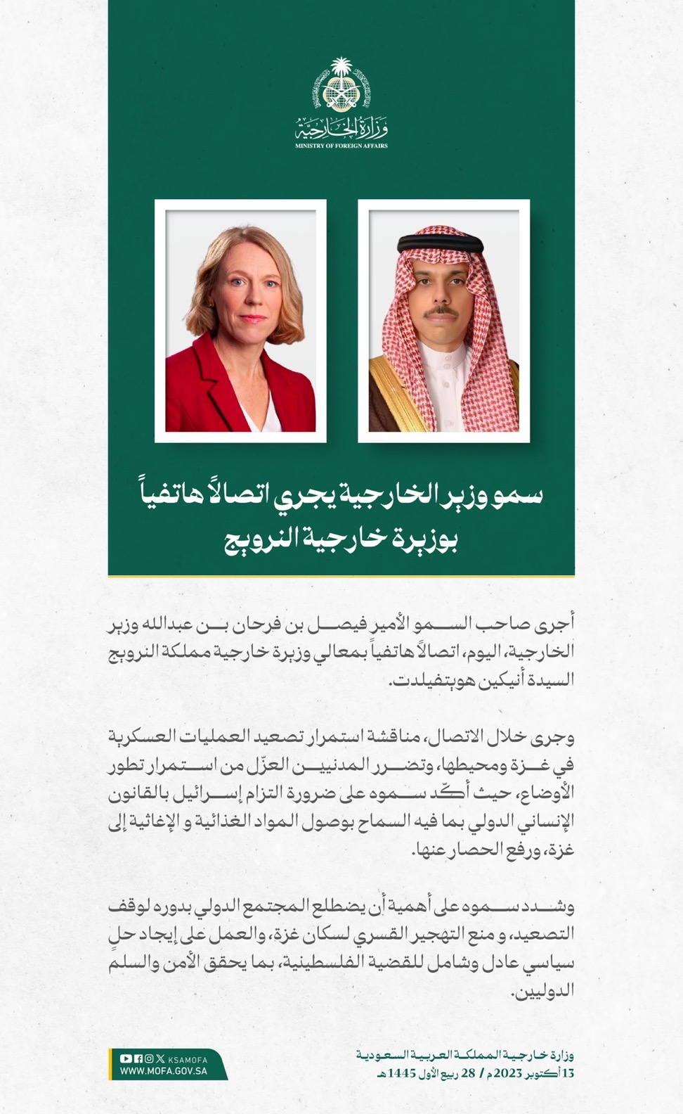 وقالت الوزارة إن المملكة طالبت برفع الحصار عن الأشقاء في غزة، وإجلاء المصابين المدنيين، والالتزام بالقوانين والأعراف الدولية والقانون الدولي الإنساني، والدفع بعملية السلام وفقاً لقرارات مجلس الأمن والأمم المتحدة، ومبادرة السلام العربية، الرامية إلى إيجاد حلٍ عادل وشامل، وإقامة دولة فلسطينية مستقلة على حدود 1967م، عاصمتها القدس الشرقية.