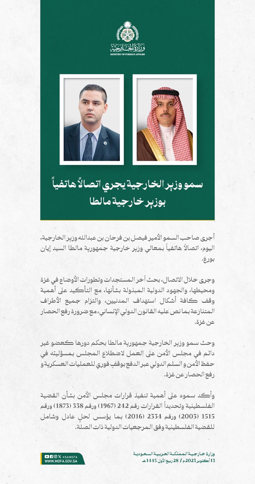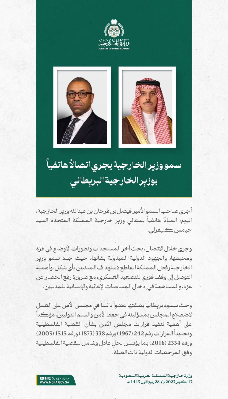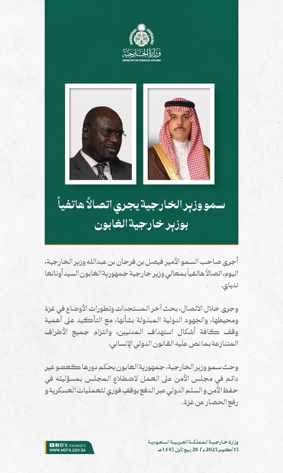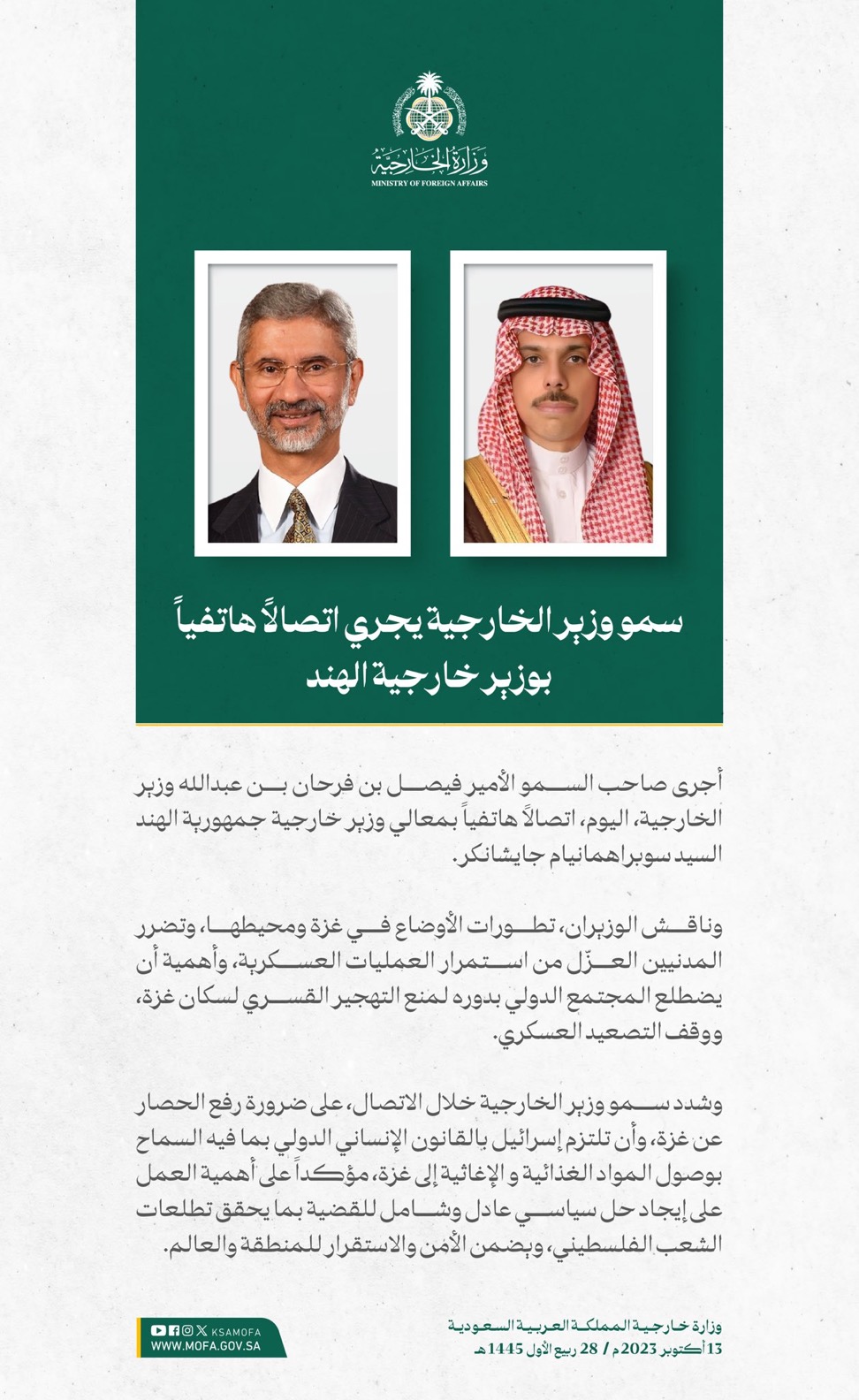 وقالت الوزارة إن المملكة طالبت برفع الحصار عن الأشقاء في غزة، وإجلاء المصابين المدنيين، والالتزام بالقوانين والأعراف الدولية والقانون الدولي الإنساني، والدفع بعملية السلام وفقاً لقرارات مجلس الأمن والأمم المتحدة، ومبادرة السلام العربية، الرامية إلى إيجاد حلٍ عادل وشامل، وإقامة دولة فلسطينية مستقلة على حدود 1967م، عاصمتها القدس الشرقية.