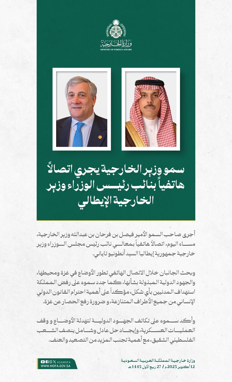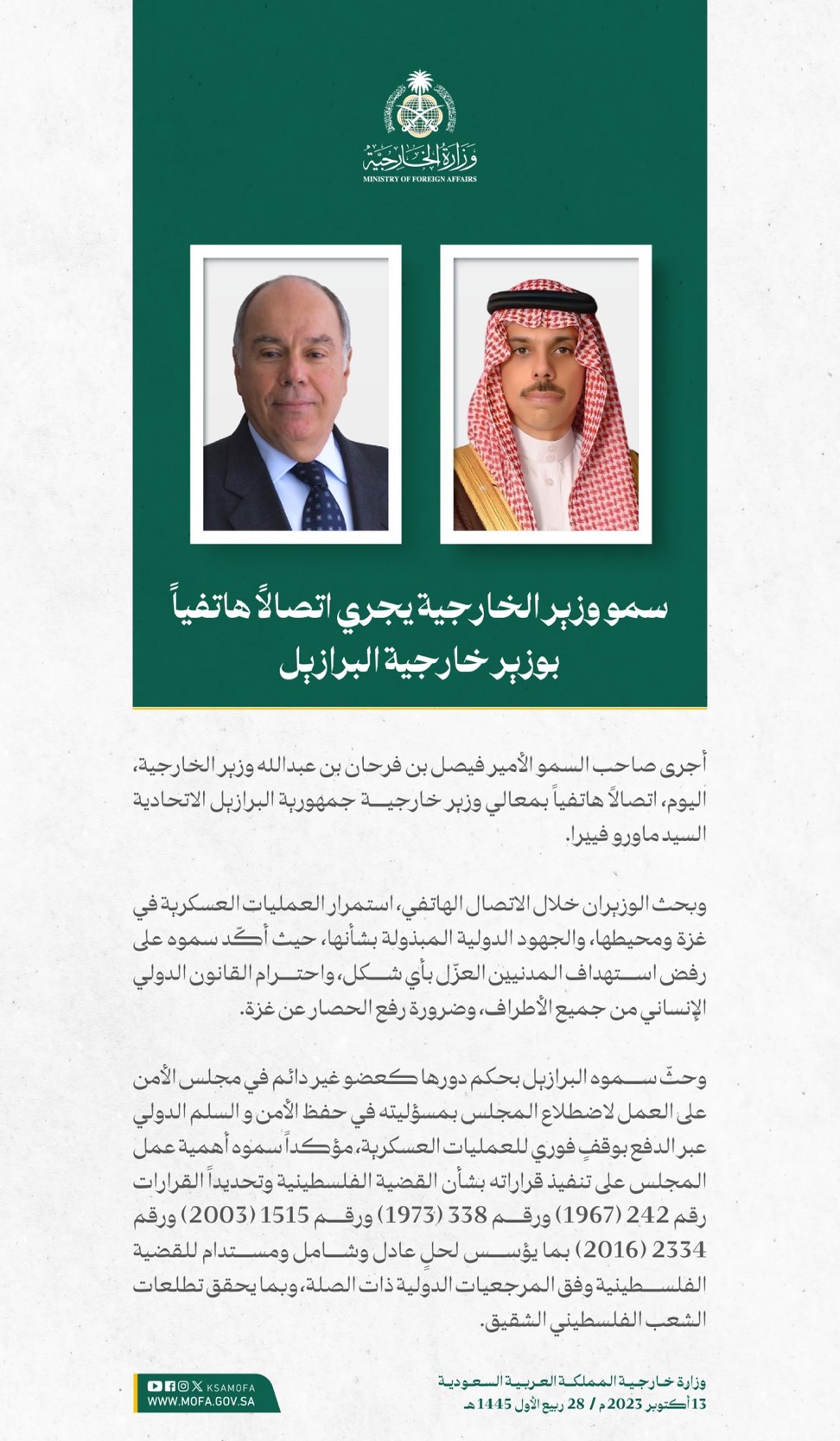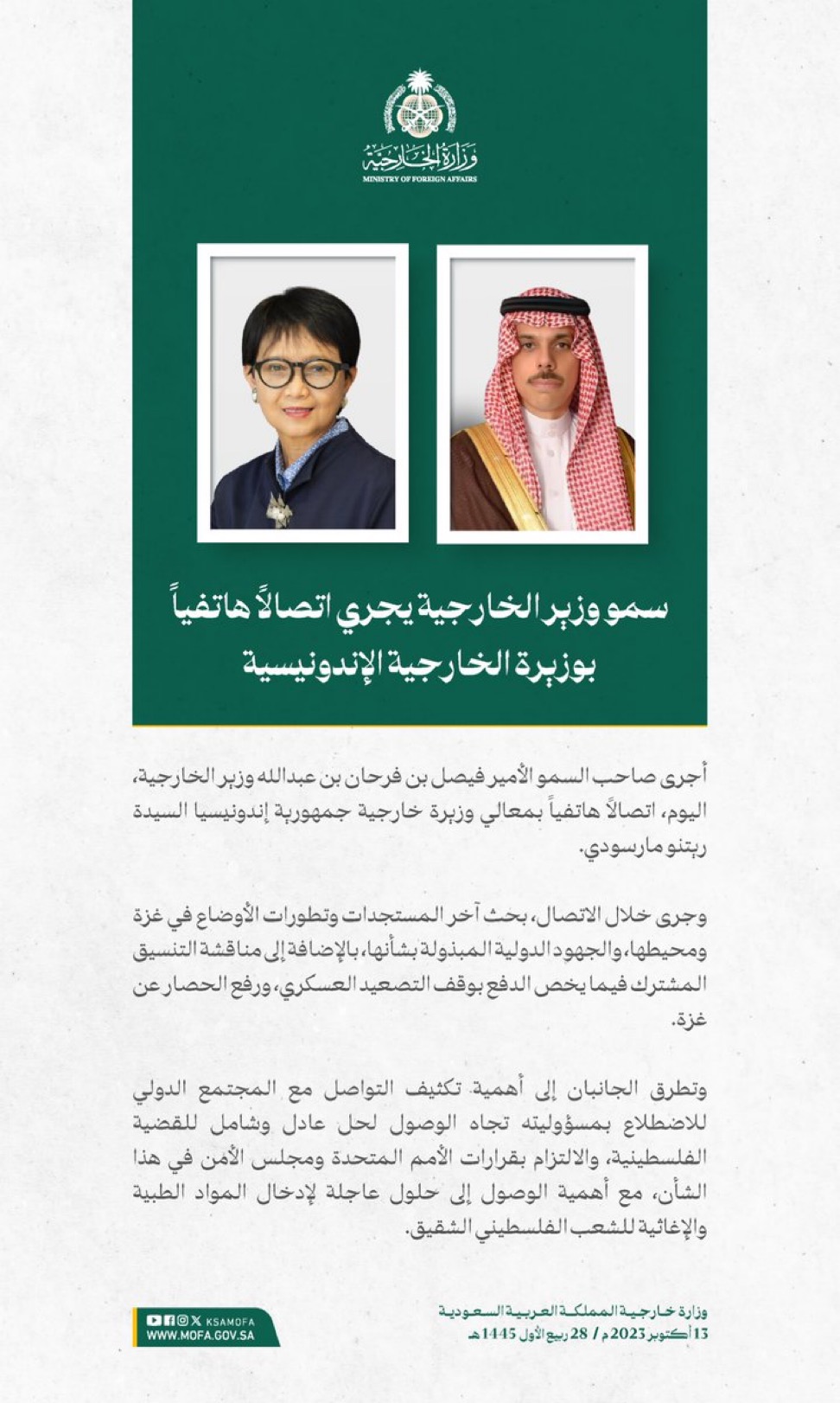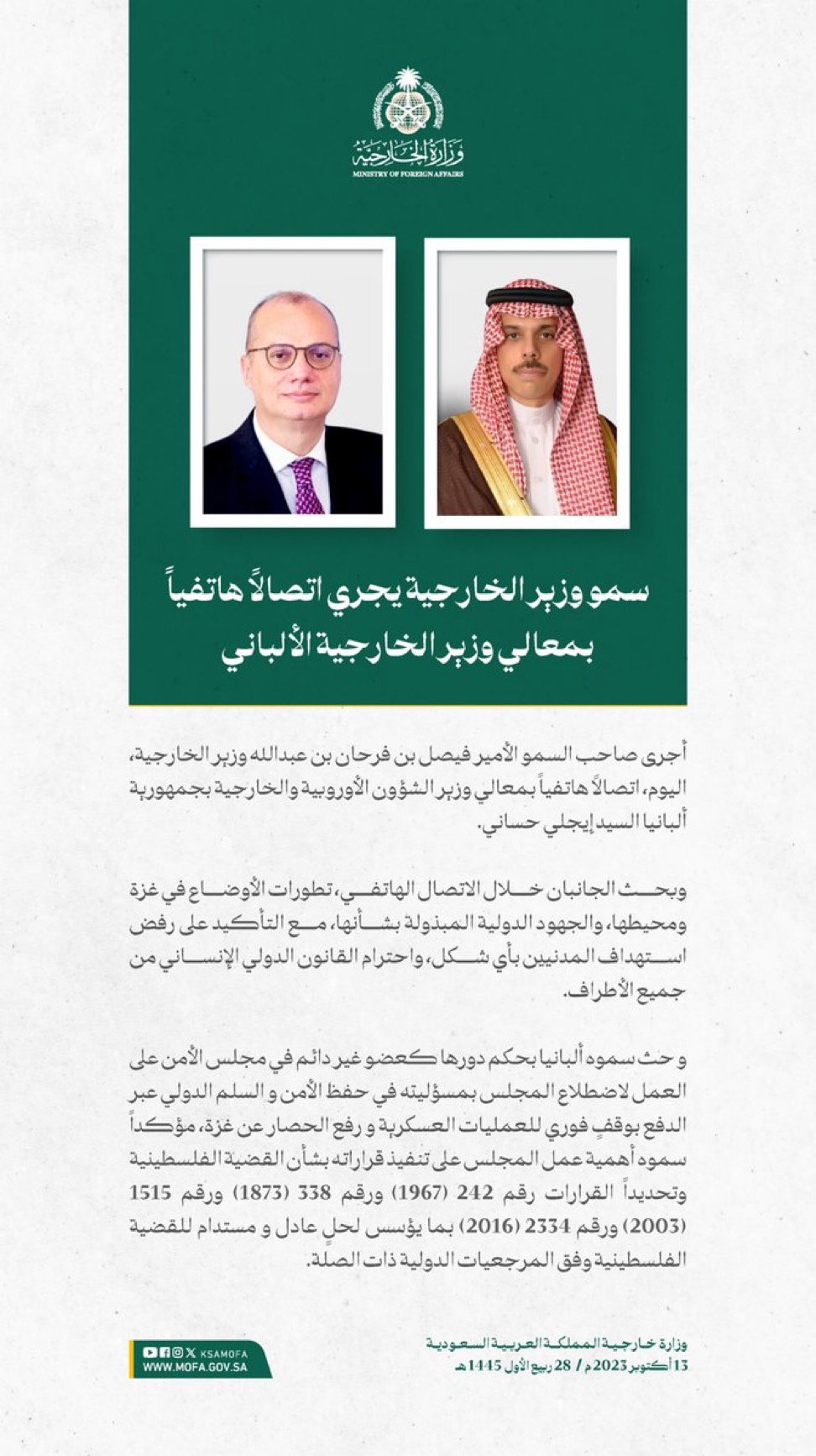 وقالت الوزارة إن المملكة طالبت برفع الحصار عن الأشقاء في غزة، وإجلاء المصابين المدنيين، والالتزام بالقوانين والأعراف الدولية والقانون الدولي الإنساني، والدفع بعملية السلام وفقاً لقرارات مجلس الأمن والأمم المتحدة، ومبادرة السلام العربية، الرامية إلى إيجاد حلٍ عادل وشامل، وإقامة دولة فلسطينية مستقلة على حدود 1967م، عاصمتها القدس الشرقية.