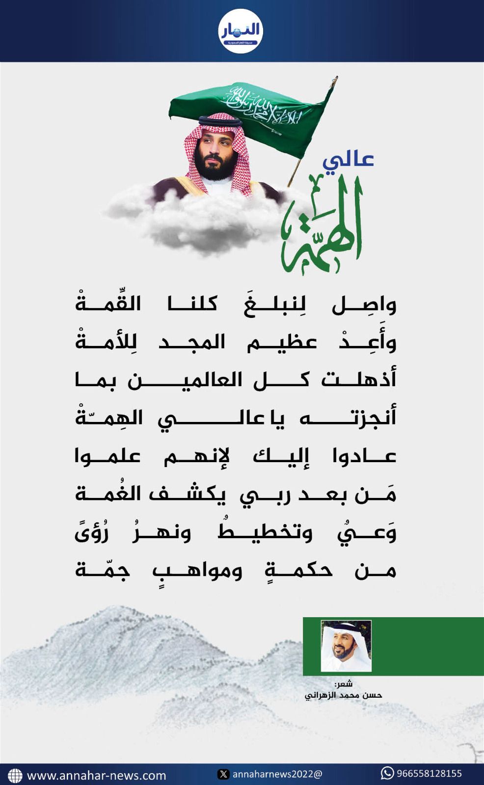 هنا عالي الهمة عنوان قصيدة الأديب الشاعر حسن بن محمد الزهراني واصفا صاحب السمو الملكي الأمير محمد بن سلمان ولي العهد رئيس مجلس الوزراء- يحفظه الله- الذي أذهل العالم بأفعاله وانجازاته وما يتمتع به سموه من حكمة ومواهب جمه