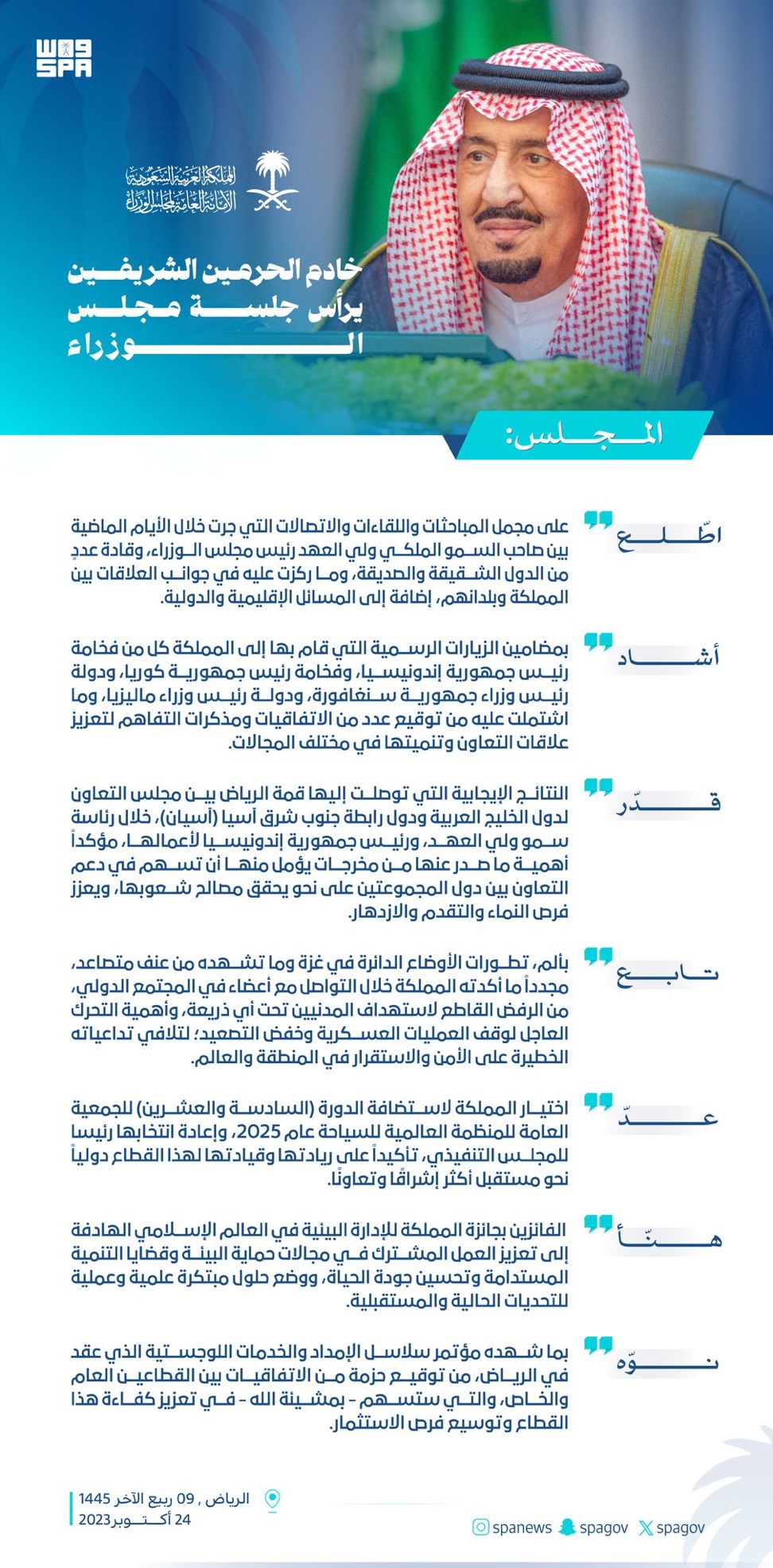 وأشاد المجلس في هذا السياق، بمضامين الزيارات الرسمية التي قام بها إلى المملكة كل من فخامة رئيس جمهورية إندونيسيا، وفخامة رئيس جمهورية كوريا، ودولة رئيس وزراء جمهورية سنغافورة، ودولة رئيس وزراء ماليزيا، وما اشتملت عليه من توقيع عدد من الاتفاقيات ومذكرات التفاهم لتعزيز علاقات التعاون وتنميتها في مختلف المجالات.