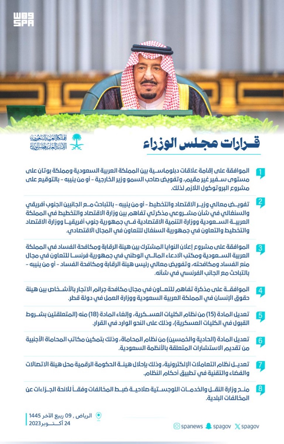 الموافقة على إقامة علاقات دبلوماسية بين المملكة العربية السعودية ومملكة بوتان على مستوى سفير غير مقيم، وتفويض صاحب السمو وزير الخارجية - أو من ينيبه - بالتوقيع على مشروع البروتوكول اللازم لذلك.