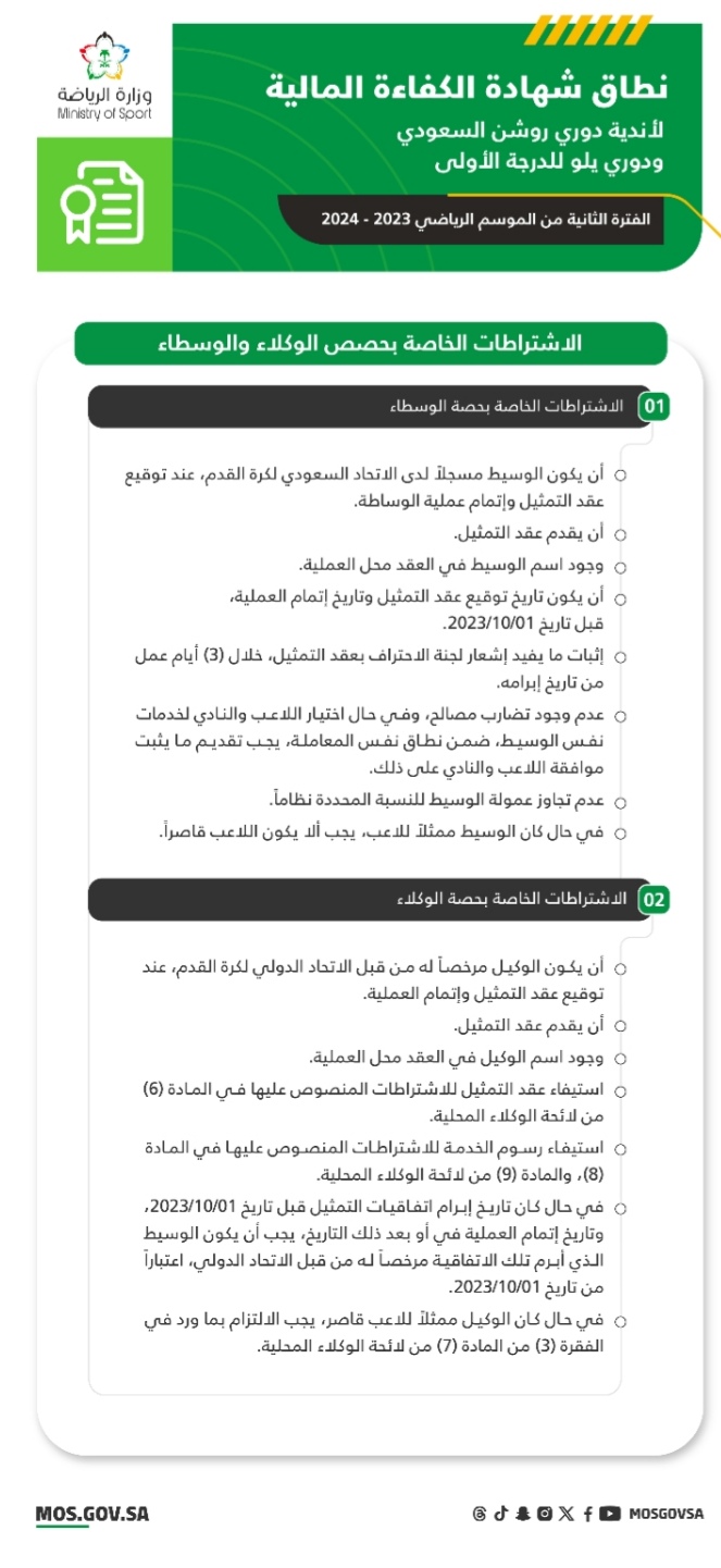 أعلنت لجنة الكفاءة المالية للأندية الرياضية، نطاق شهادة الكفاءة المالية لأندية دوري روشن السعودي، وأندية دوري يلو للدرجة الأولى، للفترة الثانية من الموسم الرياضي 2023- 2024.