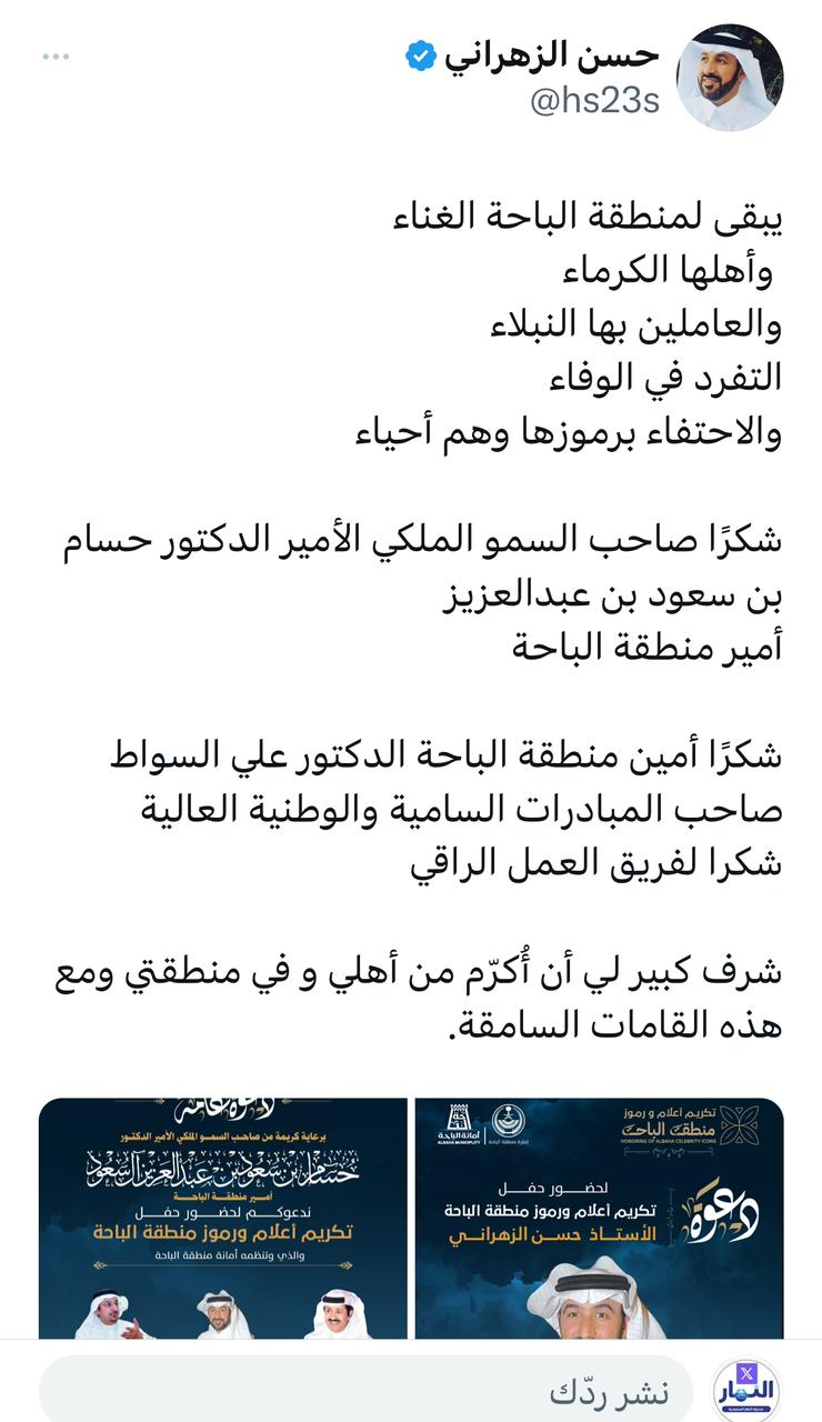 برعاية صاحب السمو الملكي الأمير الدكتور حسام بن سعود بن عبدالعزيز آل سعود، أمير منطقة الباحة، تنظم أمانة منطقة الباحة، يوم الاثنين 29 ربيع الآخر 1445هـ، الموافق 13 نوفمبر 2023م، في قاعة الحسام للمؤتمرات والمعارض، حفل تكريم لعدد من رموز وأعلام منطقة الباحة كفاء ما قدموا من أعمال ومنجزات.