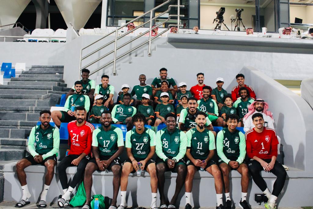 حيث تم الالتقاء باللاعبين والتصوير معهم وتوزيع اطقم المنتخب عليهم.