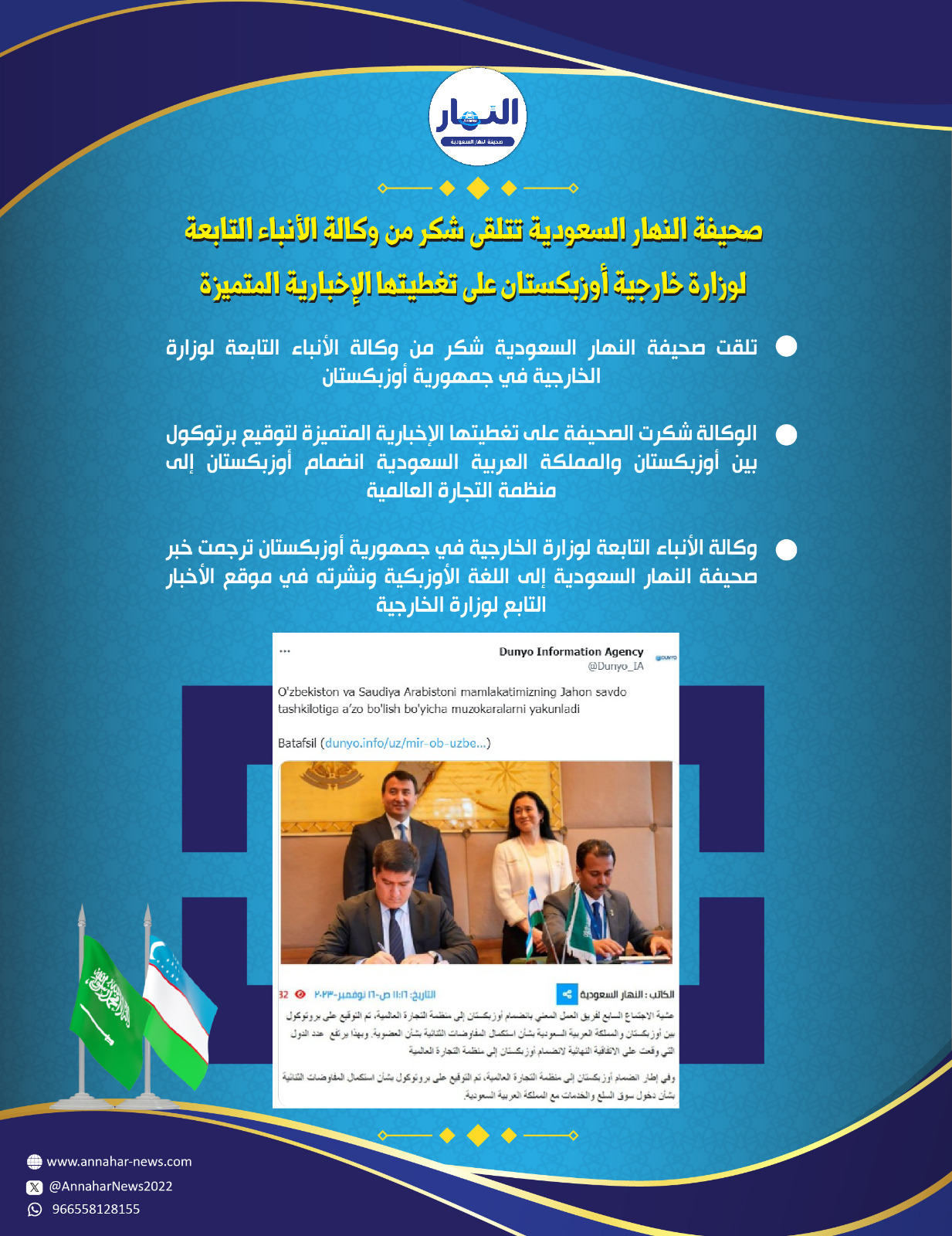 تلقت صحيفة النهار السعودية شكر من وكالة الأنباء التابعة لوزارة الخارجية في جمهورية أوزبكستان، على تغطيتها الإخبارية المتميزة الخاصة بتوقيع برتوكول بين أوزبكستان والمملكة العربية السعودية بشأن استكمال المفاوضات الثنائية بشأن انضمام أوزبكستان إلى منظمة التجارة العالمية.