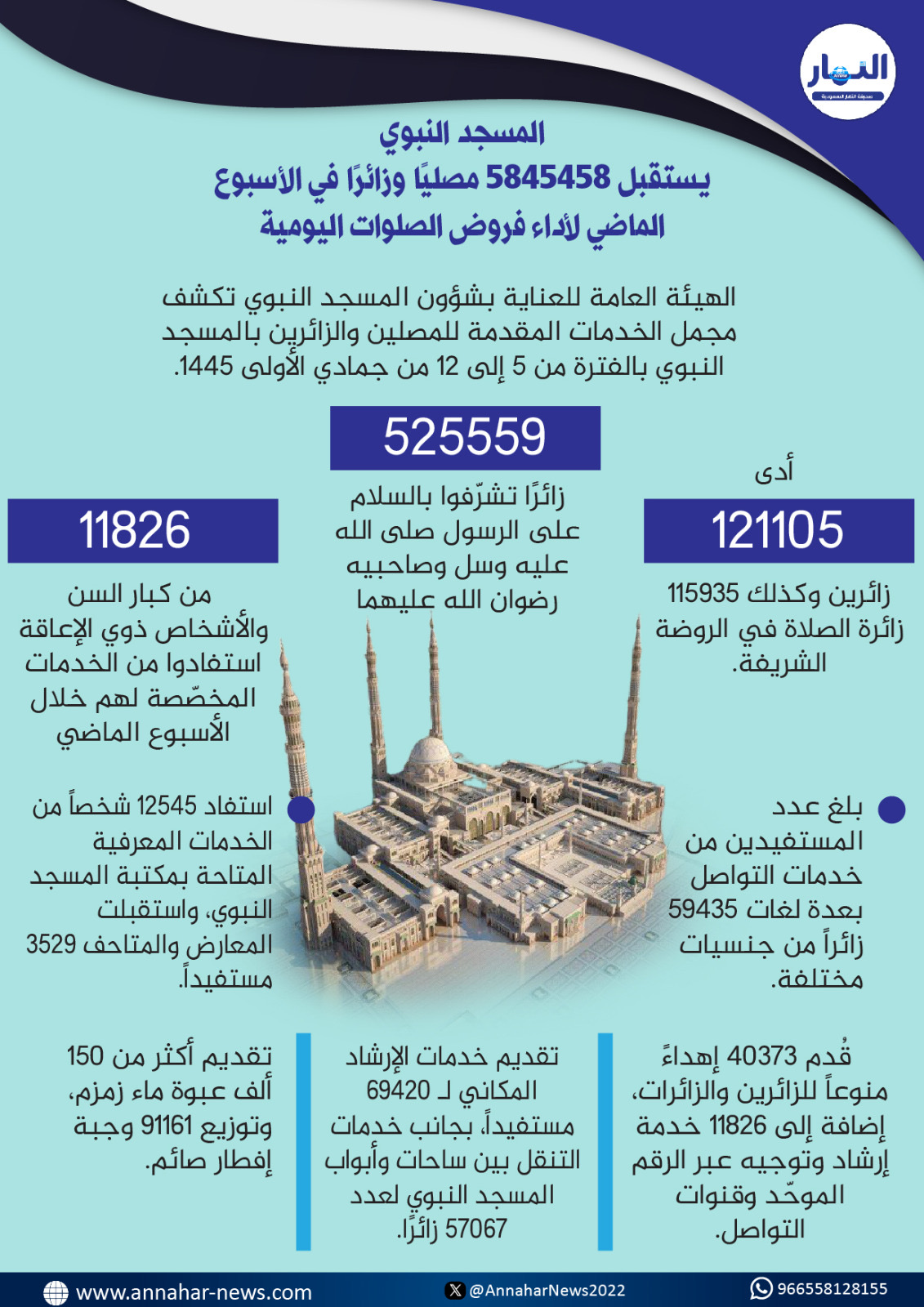 وبيّنت الهيئة في تقرير إحصائي عن مجمل الخدمات التي قُدمت للمصلين والزائرين بالمسجد النبوي خلال الفترة من الـ 5 وحتى الـ 12 من شهر جمادي الأولى الحالي، أن 525559 زائرًا تشرّفوا بالسلام على الرسول –صلى الله عليه وسل – وصاحبيه -رضوان الله عليهما كما أدى 121105 زائرين، وكذلك 115935 زائرة الصلاة في الروضة الشريفة، وفق الإجراءات التنظيمية المتبعة في تنظيم الحشود ومواعيد الزيارة للرجال والنساء.