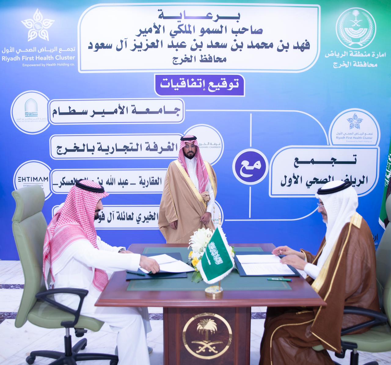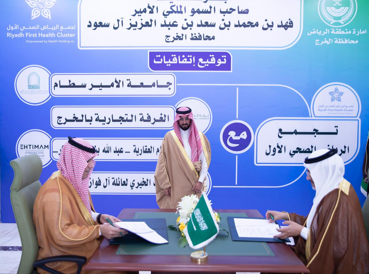 بعد ذلك رعى سمو محافظ الخرج توقيع تجمع الرياض الصحي الأول بعدد من الاتفاقيات الاستراتيجية مع جامعة الأمير سطام بن عبدالعزيز، وغرفة الخرج، وشركة اهتمام العقارية بتطوير قسم الطوارئ بمستشفى الولادة والأطفال بالخرج، و الوقف الخيري لعائلة آل فواز وآل جمعة وذلك بتأمين جهاز قارئ الأشعة لمركز صحي اليمامة.