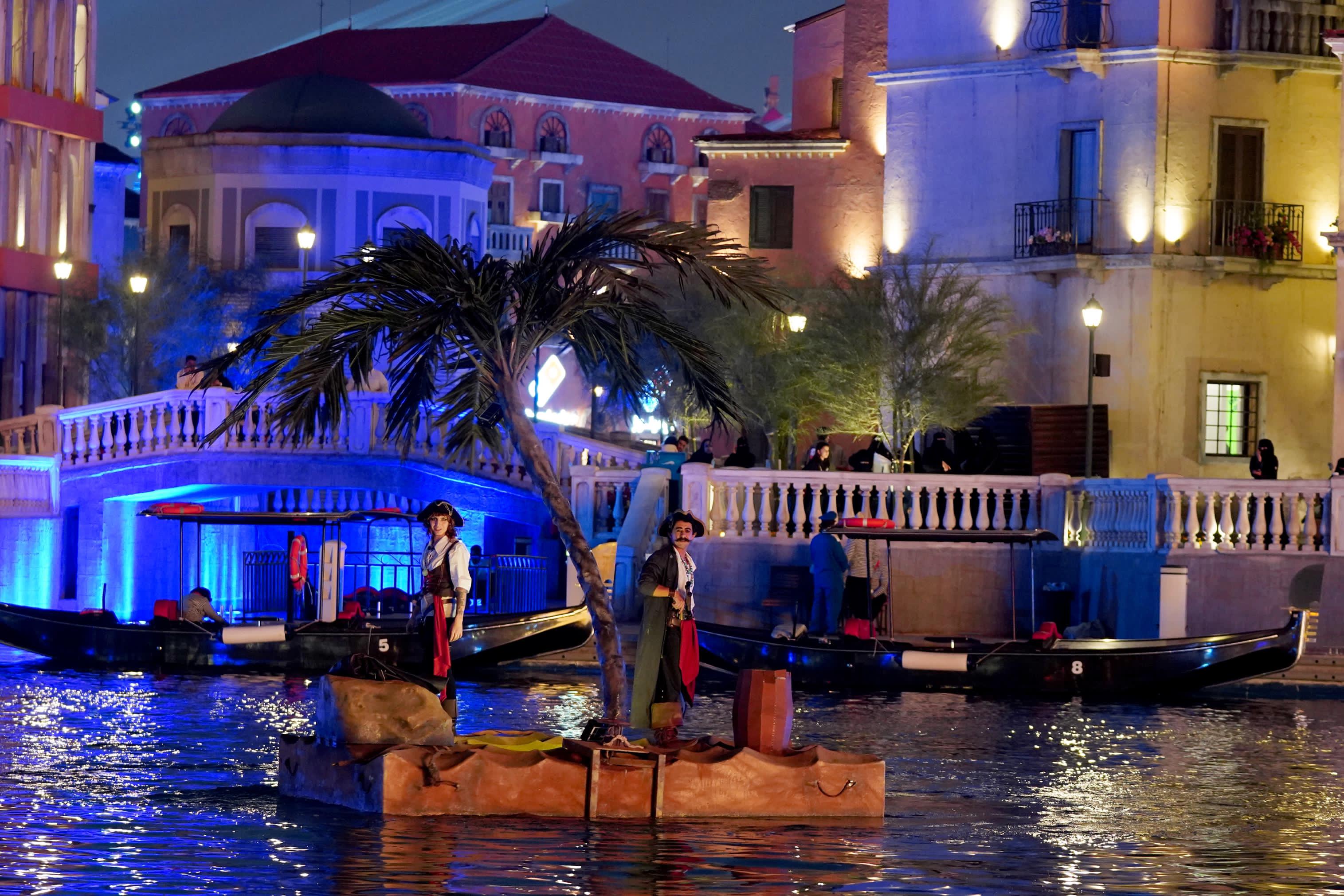 وضمن فعاليات العرض يصعد القراصنة لأعلى السفينة؛ ليتمكن الزوار من رؤيتهم في المناطق القريبة من البحيرة، ويؤدون مجموعة من العروض البهلوانية بالأحبال التي يتسلقون من خلالها متن السفينة.