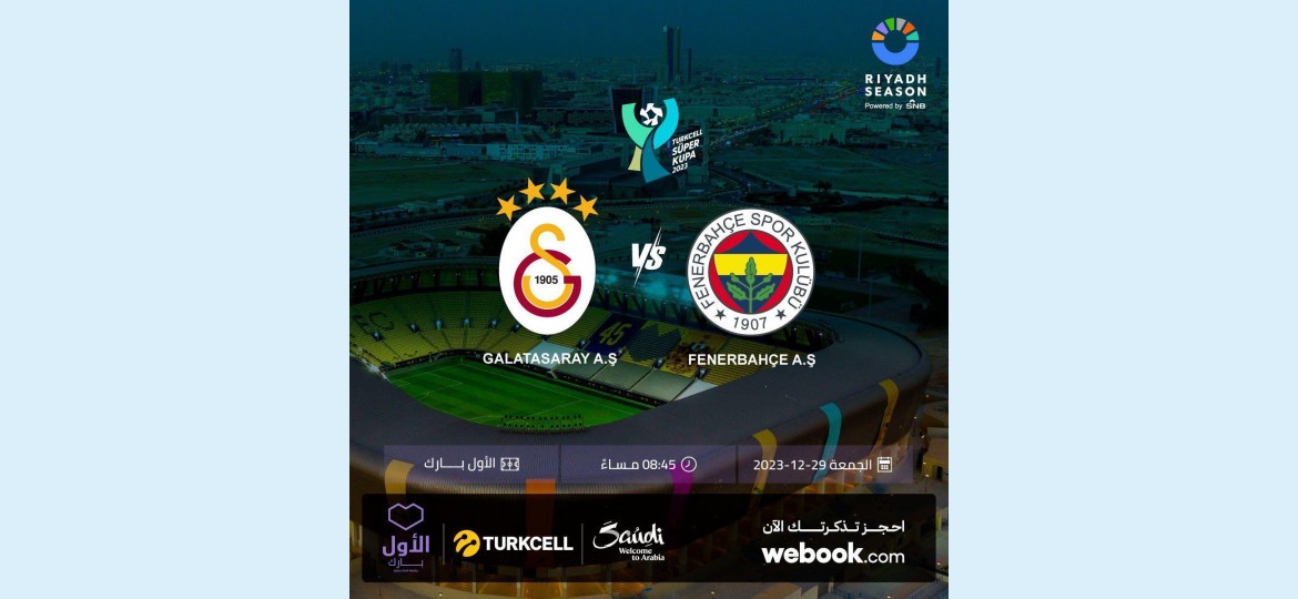 وتعد استضافة مباراة السوبر التركي واحدة من فعاليات موسم الرياض هذا العام، حيث ينظم عددا من المناسبات الرياضية، والفعاليات العالمية التي تجد اهتماما كبيرا من الجماهير الرياضية في جميع أنحاء العالم، ويمكن حضور المباراة من خلال الرابط:https://webook.com/ar/events/galatasaray-vs-fenerbahce .