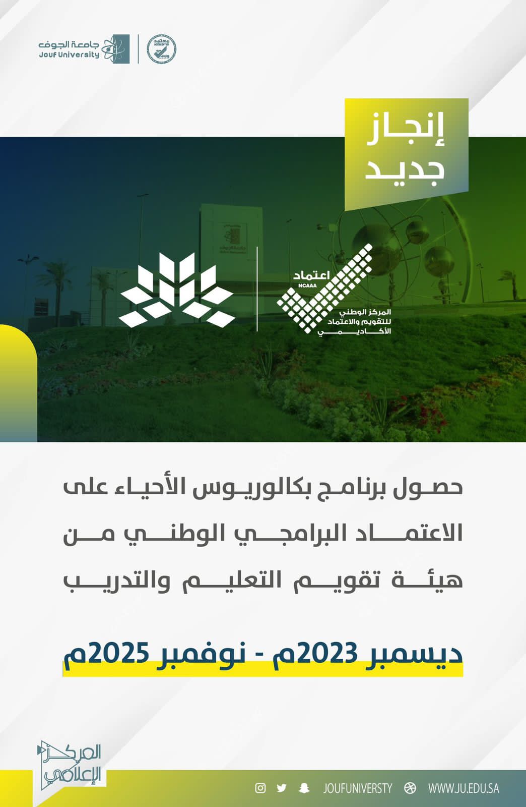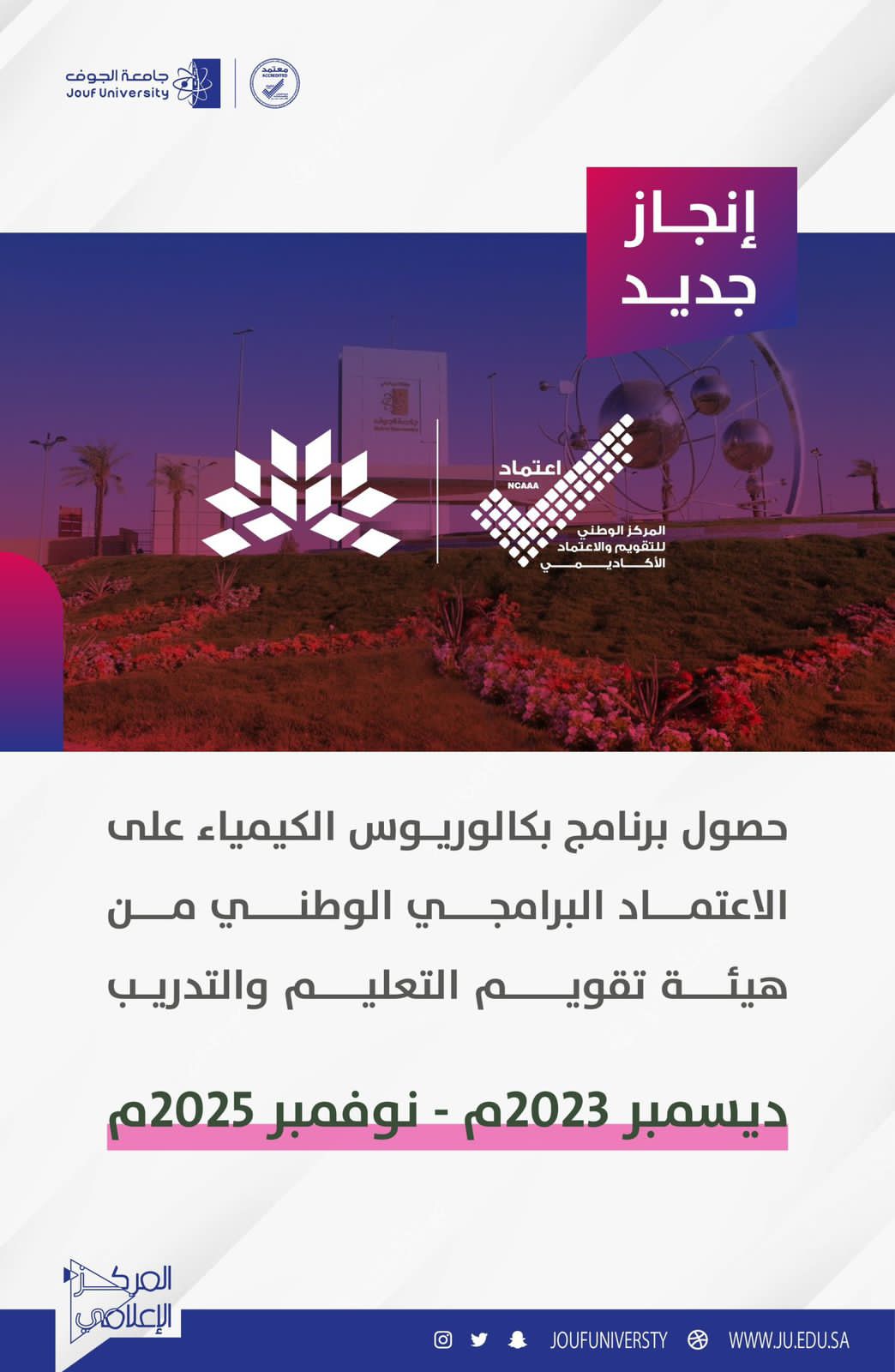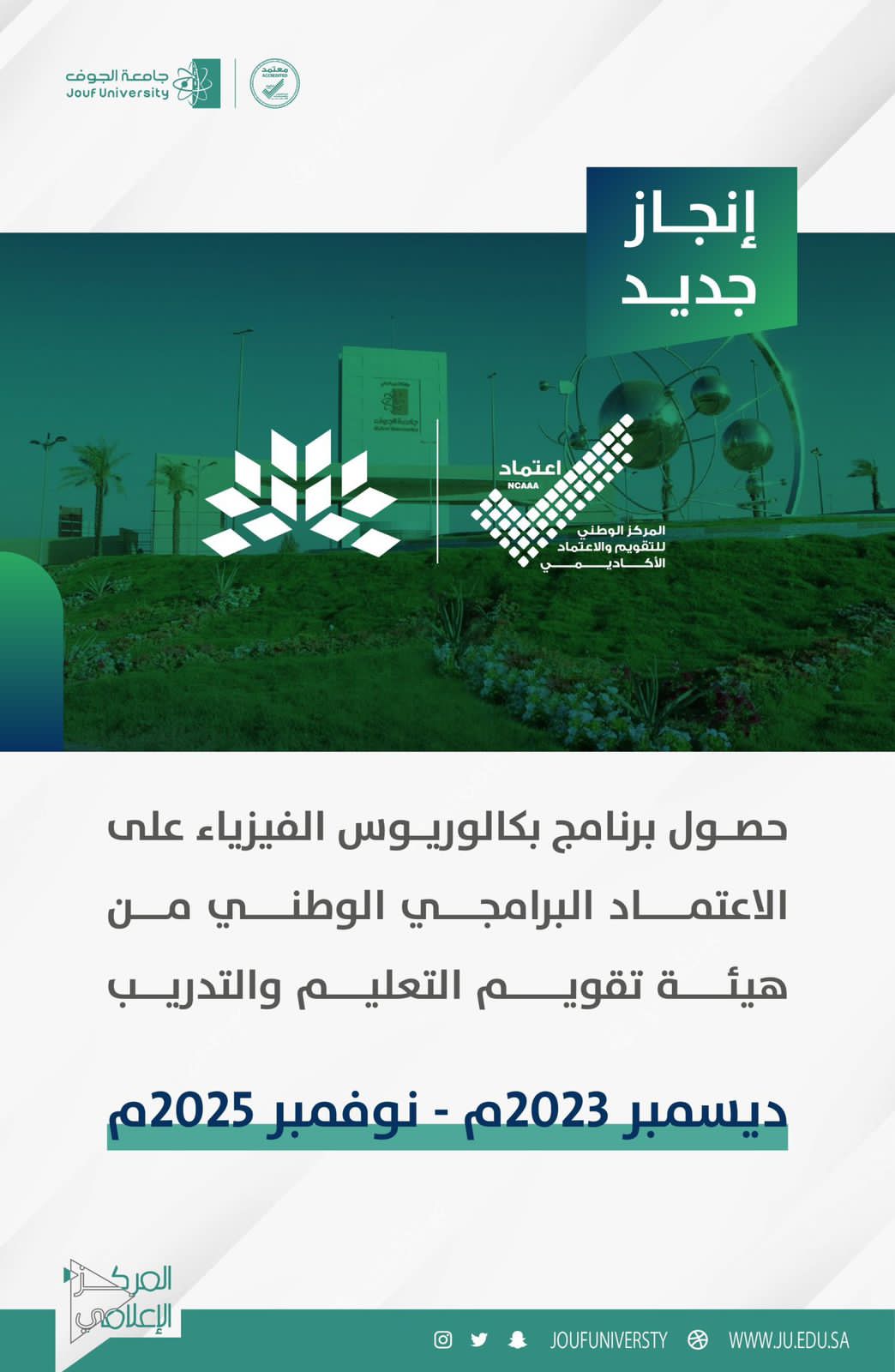 حصلت برامج الفيزياء والكيمياء والأحياء والرياضيات بكلية العلوم بجامعة الجوف على الاعتماد البرامجي لمدة سنتين من هيئة تقويم التعليم والتدريب.