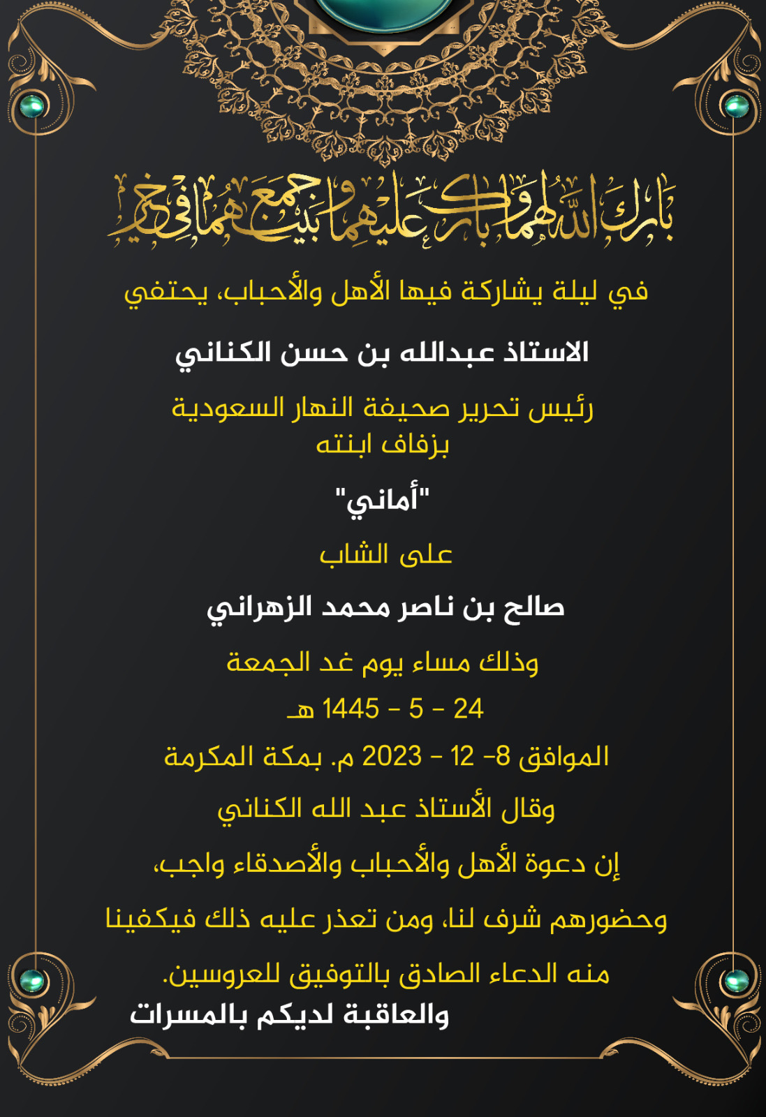 وأكد الأستاذ عبد الله الكناني، أن دعوة الأهل والأحباب والأصدقاء واجب، وحضورهم ومشاركتهم شرف له، ومن تعذر عليه ذلك، فيكفينا منه الدعاء الصادق بالتوفيق للعروسين، والعاقبة لدى الجميع بالمسرات.