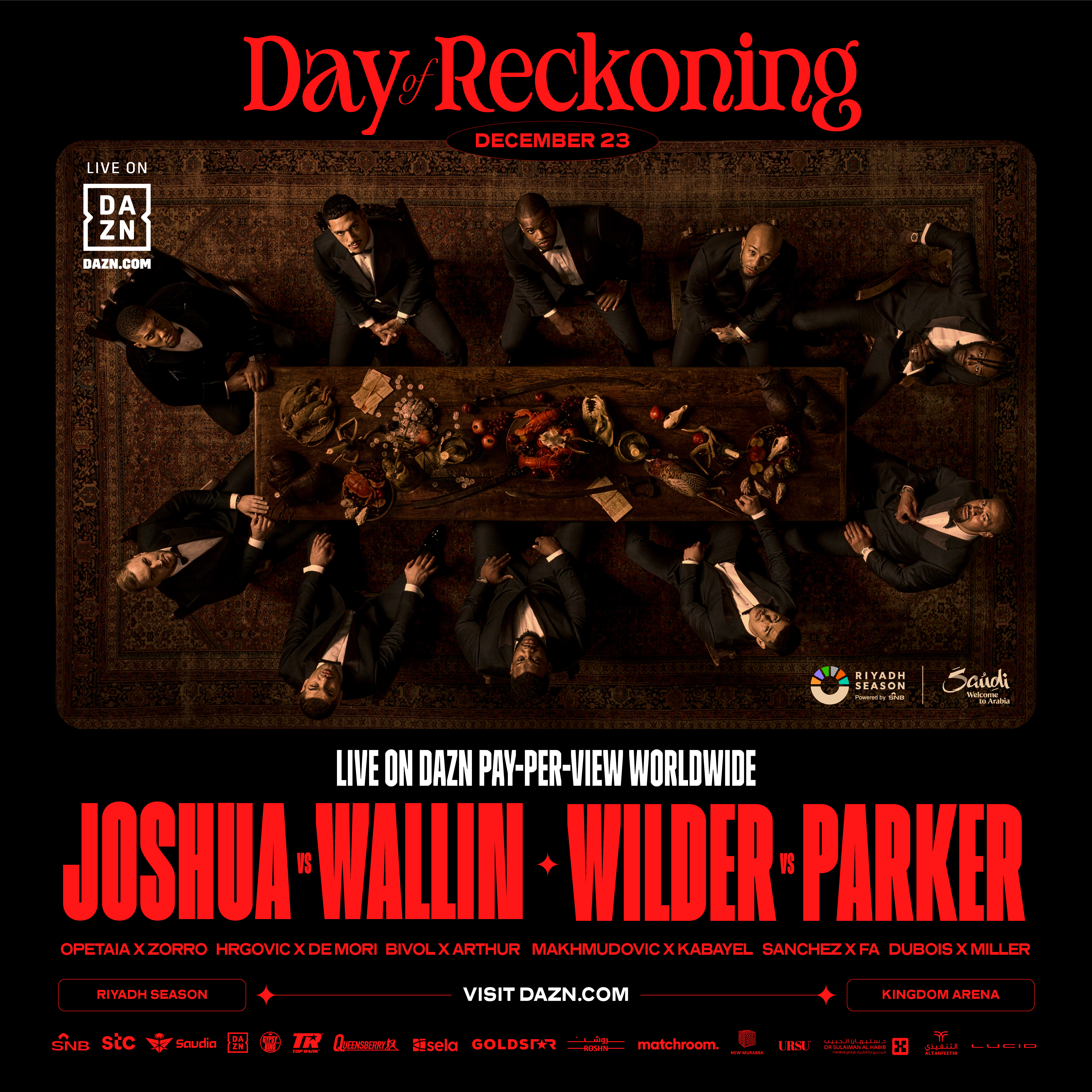 وأما أبطال الوزن الثقيل، سيواجه أرسلانبيك محمودوف المخيف بطل أوروبا أجيت قبايل. وسيحاول دانييل دوبوا، المنافس الأخير على اللقب العالمي، استعادة اللقب عندما يدخل في معركة العمالقة ضد بيج بيبي جاريل ميلر، وسيقترب فرانك سانشيز، المنافس الأعلى في الوزن الثقيل، من فرصة الحصول على اللقب العالمي إذا تمكن من التغلب على جونيور فا في العاصمة الرياض.