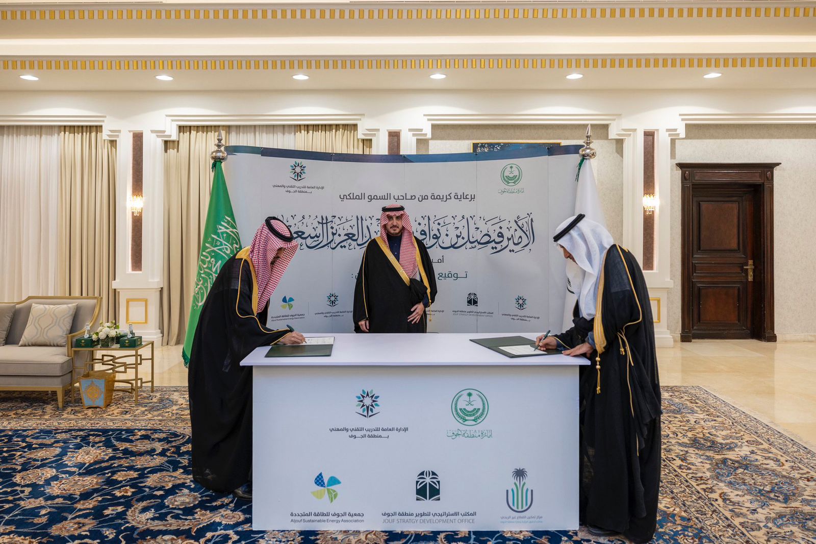 كما رعى سموه توقيع مذكرة تفاهم بين جمعية الجوف للطاقة المتجددة، ويمثلها المستشار الخاص لسمو أمير منطقة الجوف، المشرف العام على مكتب تحقيق الرؤية بالإمارة، الدكتور أحمد بن محمد السناني، والإدارة العامة للتدريب التقني والمهني بالمنطقة، ويمثلها مدير عام الإدارة العامة للتدريب التقني والمهني بالمنطقة ماجد العتيبي، حيث تهدف الاتفاقية إلى تعزيز التعاون بين الطرفين؛ لتحقيق التكامل، وتوحيد الجهود، من خلال تبادل الخبرات والتجارب، والمشاركة في الأنشطة والفعاليات المتعلقة في مجال الطاقة المتجددة، وتحقيق المنافع المشتركة.