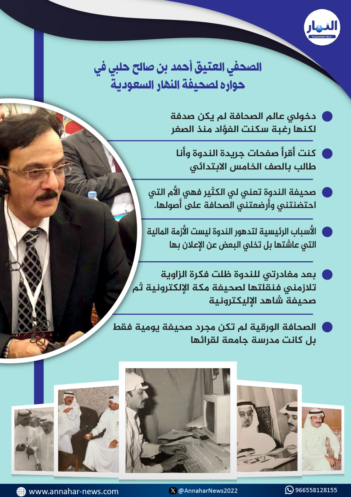 يسعدنا ويشرفنا بصحيفة النهار السعودية، أن يكون حوارنا مع الصحفي العتيق الأستاذ أحمد بن صالح حلبيا، لنطرح عليه اسئلة طالما تبقى دون أجوبه، ونريد أن نستجلي منه الأجوبة، لأنه يتسم بالصراحة ولرحلته الطويلة في اروقة الصحافة، وكيف يرى الصحافة قبل أربعة عقود خلال الثمانينيات والتسعينيات إلى العقد الأخير في العشرينيات.