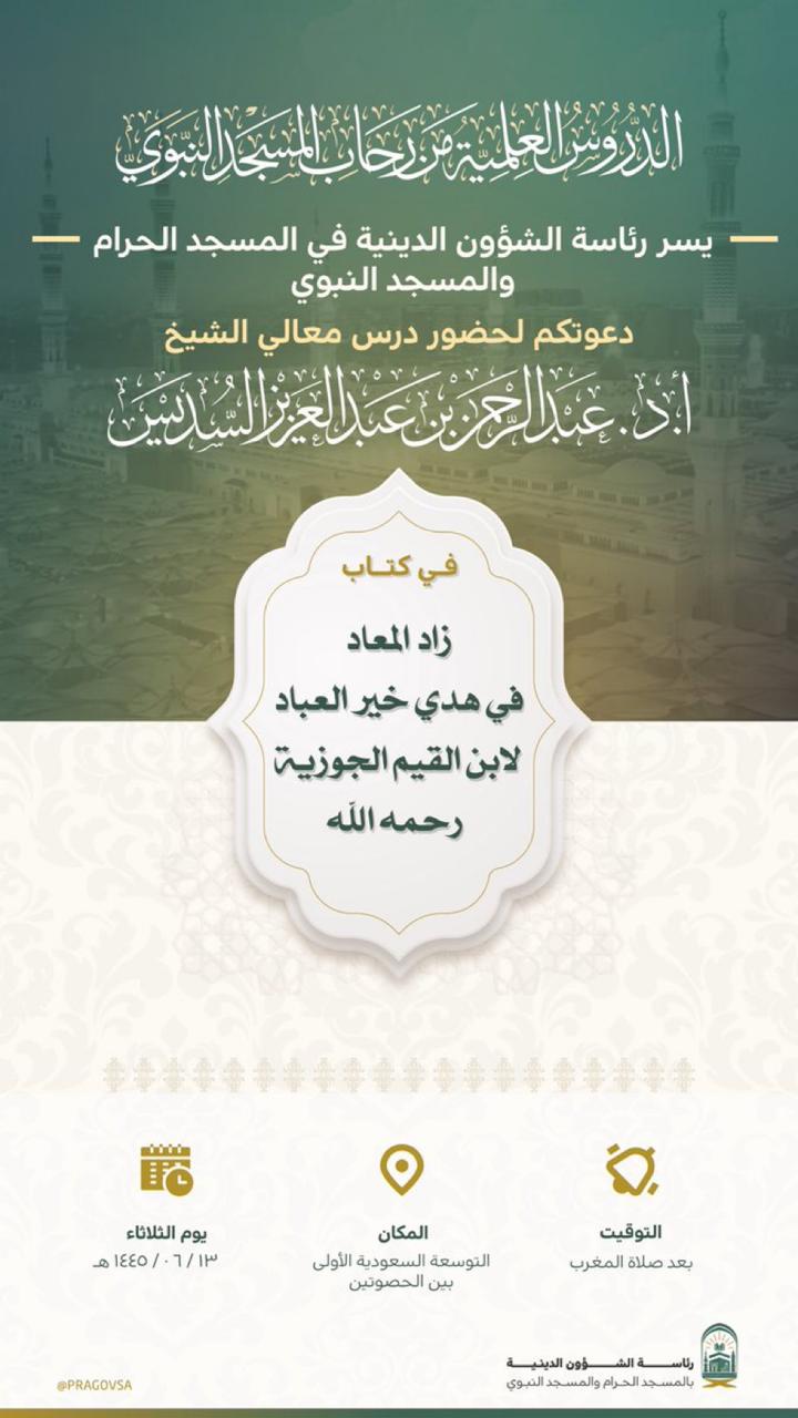 يلقي معالي رئيس الشؤون الدينية بالمسجد الحرام والمسجد النبوي، الشيخ الأستاذ الدكتور: عبدالرحمن السديس، درسه العلمي الشهري في رحاب المسجد النبوي، اليوم الثلاثاء، من كتاب: "زاد المعاد في هدي خير العباد" لابن القيم -رحمه الله-.